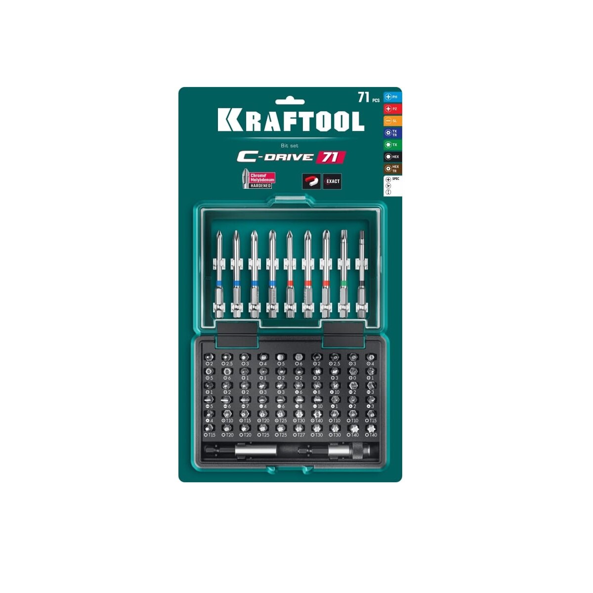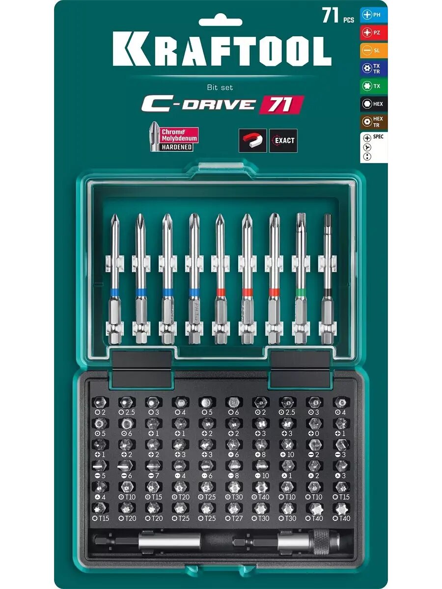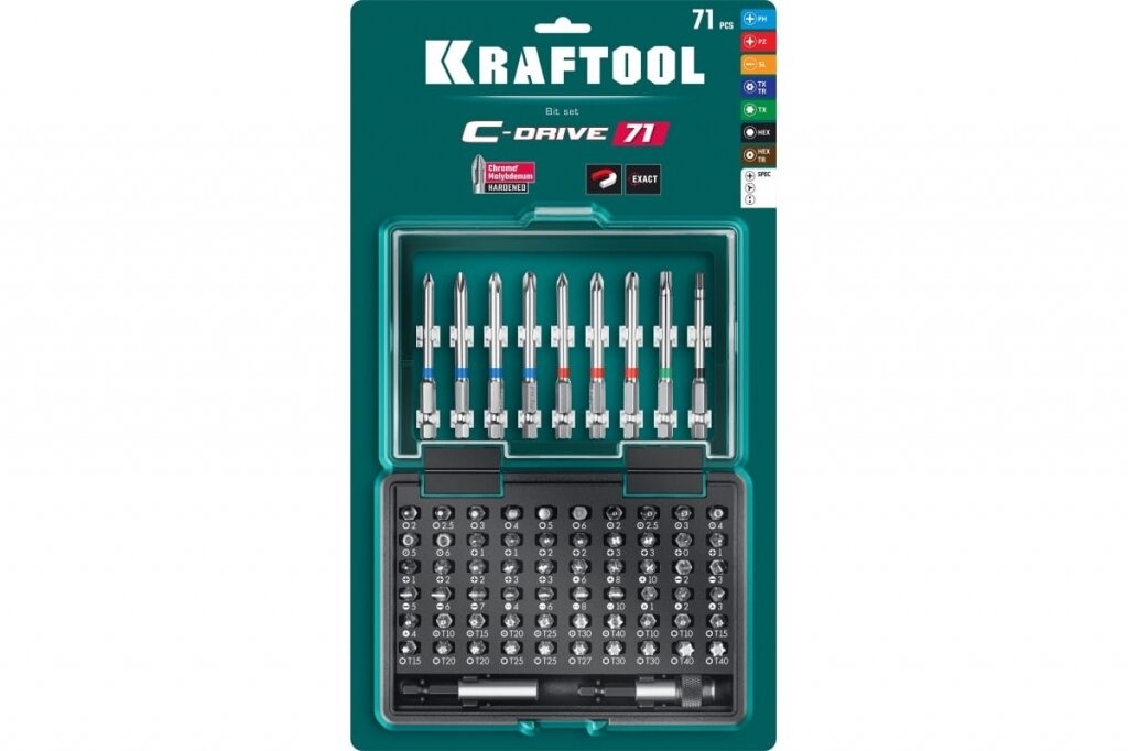 Набор KRAFTOOL: Биты "C-Drive 71" многофункциональные, CR-MO, адаптеры в ударопрочном компактном боксе, цветная маркировка типов шлицов. 71 предмет