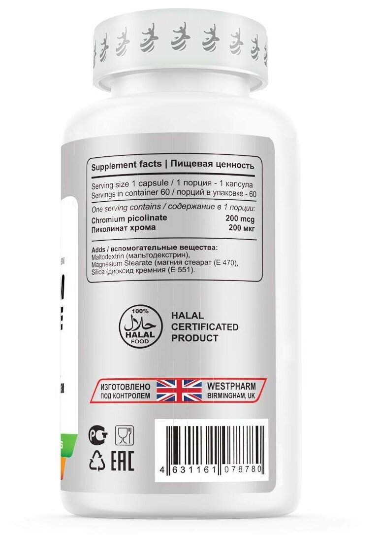 Westpharm / Vegan line / Chromium Picolinate / Пиколинат Хрома 200мг / Снижение аппетита / 60 капсул