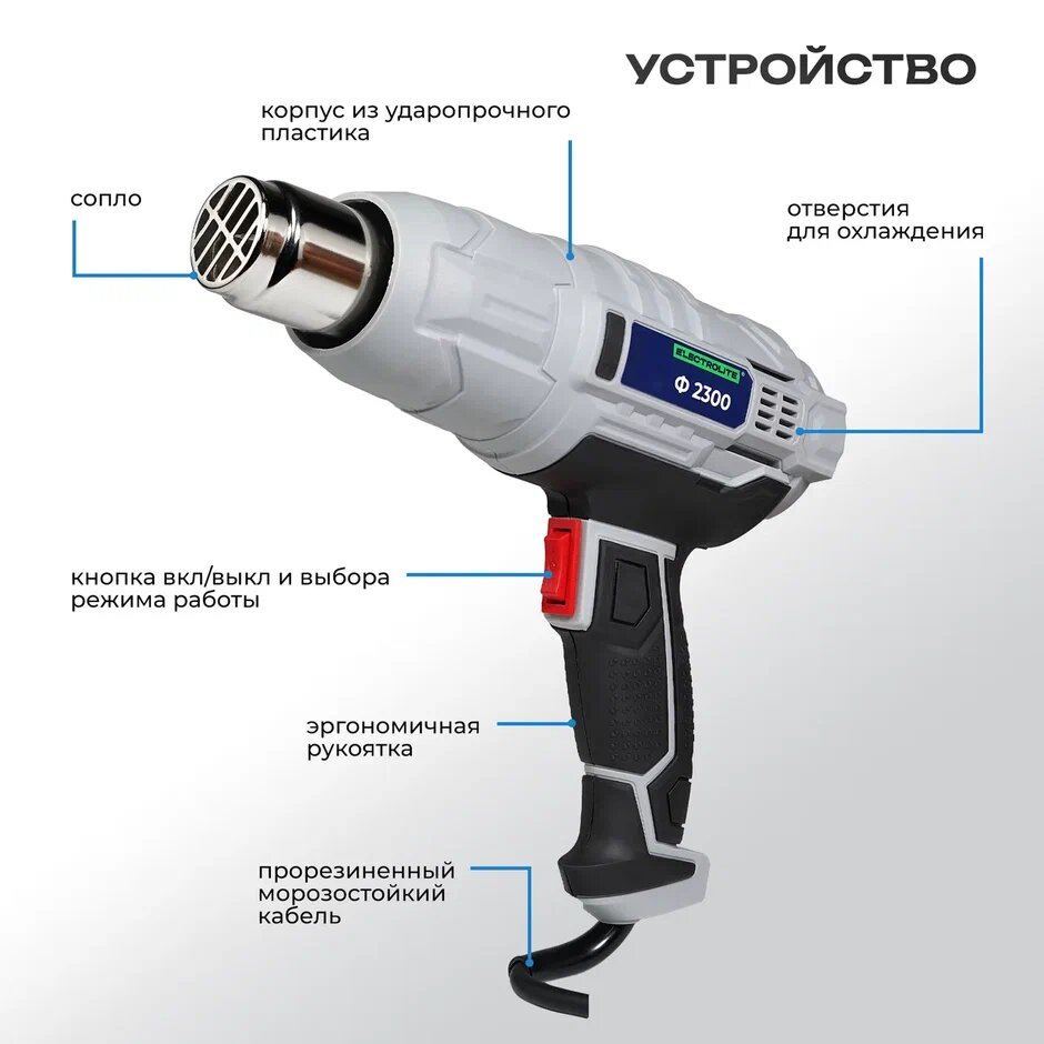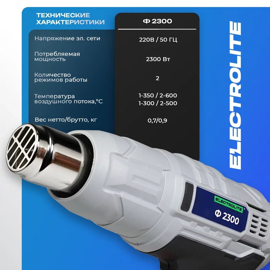 Фен строительный / технический ELECTROLITE Ф 2300 ( 2300 Вт, 220 В, 400/600 С, 300/500 л/мин, резиновая рукоять )