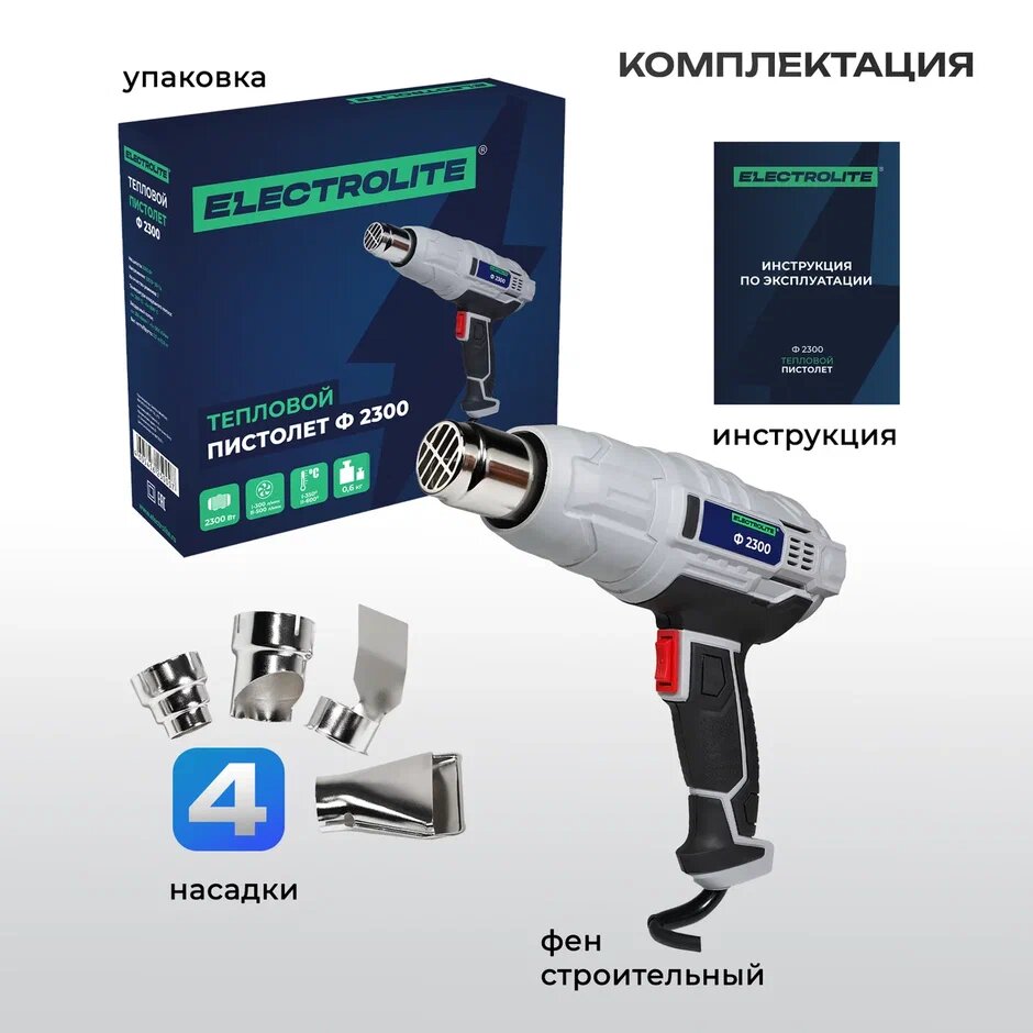 Фен строительный ELECTROLITE Ф2300EL ( 2300 Вт, 220 В, 400/600 С, 300/500 л/мин, обрезиненная рукоять )