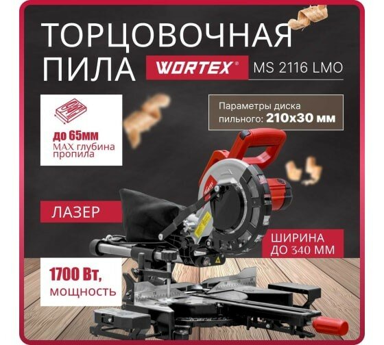Торцовочная пила консольного типа WORTEX MS 2116-1 LM 1800 Вт, 210х30.0 мм, глуб. до 65 мм, шир. до 300 мм, лазер