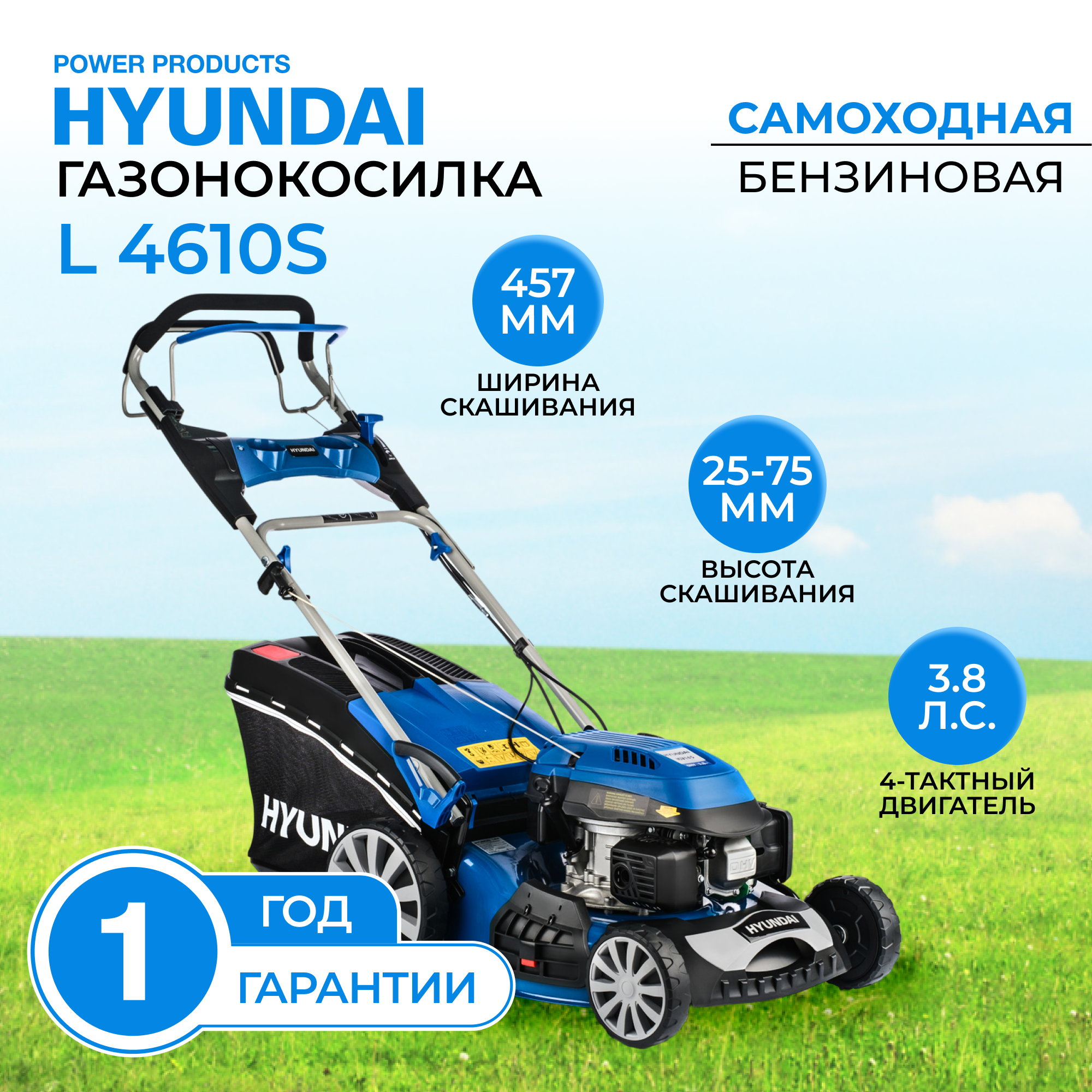 Газонокосилка бензиновая самоходная Hyundai L 4610S, 3,8 л.с, 65 л