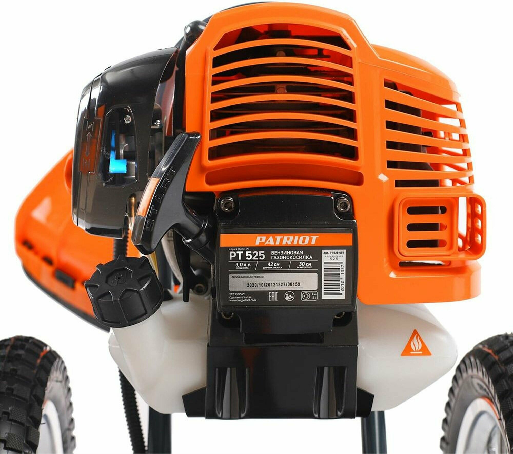 PATRIOT PT 525 Газонокосилка бензиновая [512109525] { 42см, 3л.с, 52сс, катушка + 3Т нож, колёса 30см пневмо }