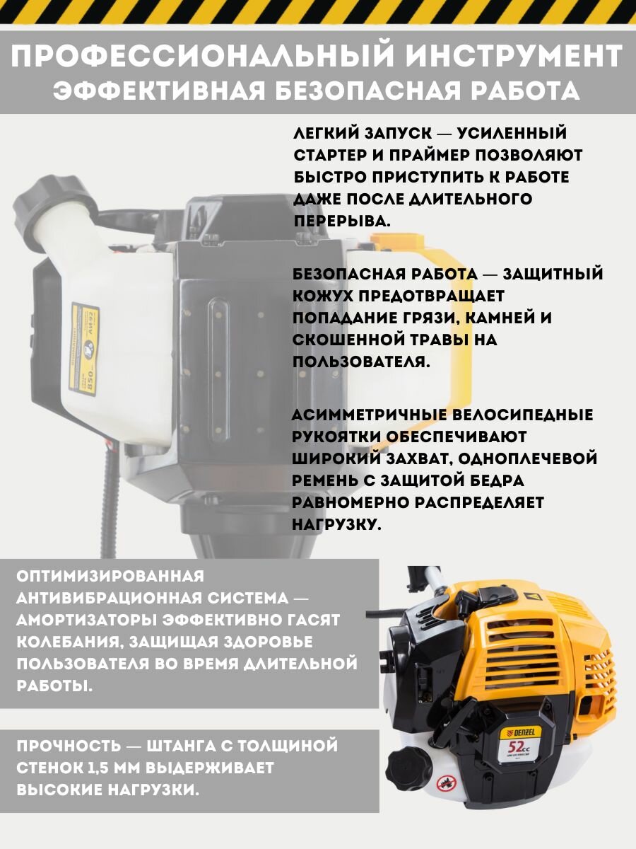 Триммер бензиновый Denzel DGT-52-PRO анти-вибро, 52 см3, неразъем, состоит из 2 частей 96278