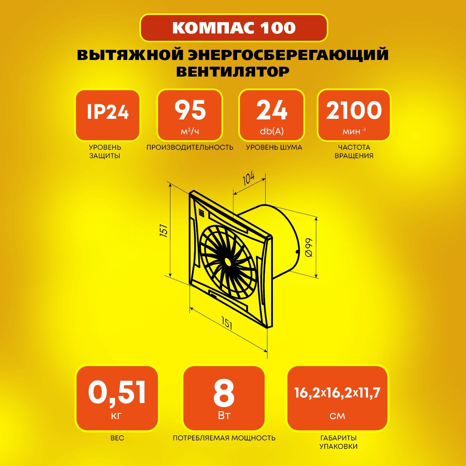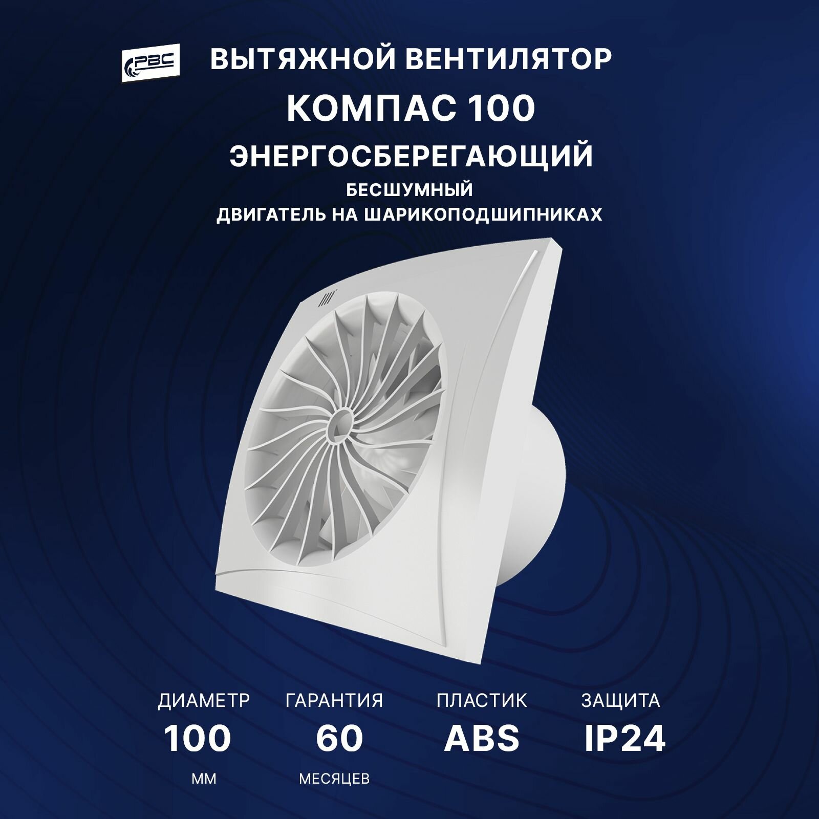 Вентилятор тихий вытяжной РВС Компас 100 энергосберегающий 8Вт 24дБ 95м3/ч