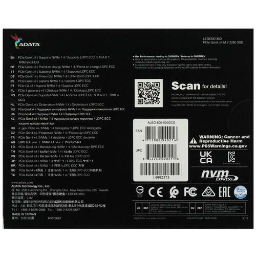 Жесткий диск SSD ADATA M.2 2280 500GB LEGEND 800 PCIe Gen4x4 with NVMe, 3500/2200, MTBF 1,5M, 3D NAND, 300TBW, Heat Sink, RTL (ALEG-800-500GCS)
