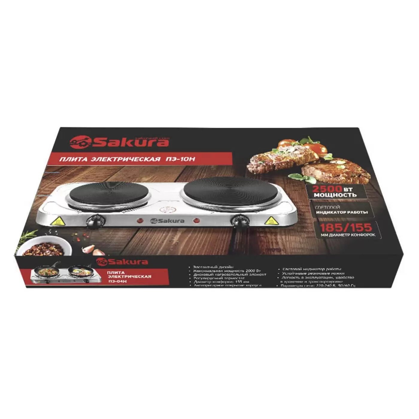 Электрическая плитка Sakura ПЭ-10Н 2500 Вт, 185/155 мм, 2 конфорки/диск, нержавеющая сталь РТ-00069385