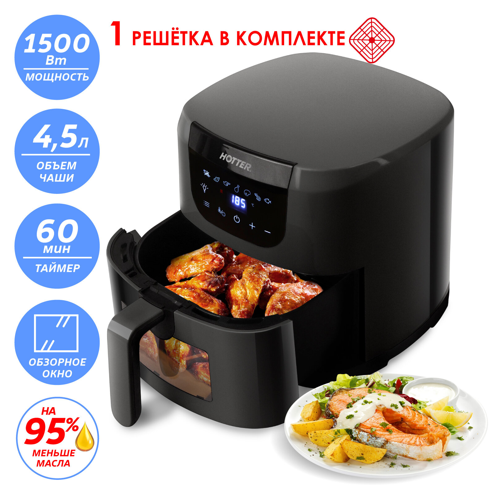 Аэрогриль HOTTER HX-588, объем 4.5л, 7 автопрограмм , регулировка времени и температуры, обзорное окно, черный интересное: