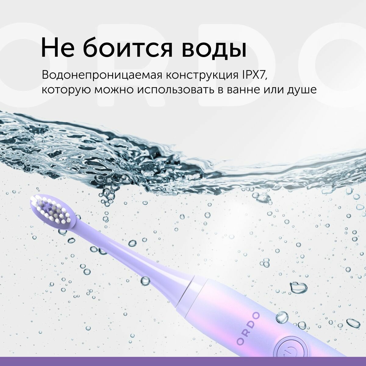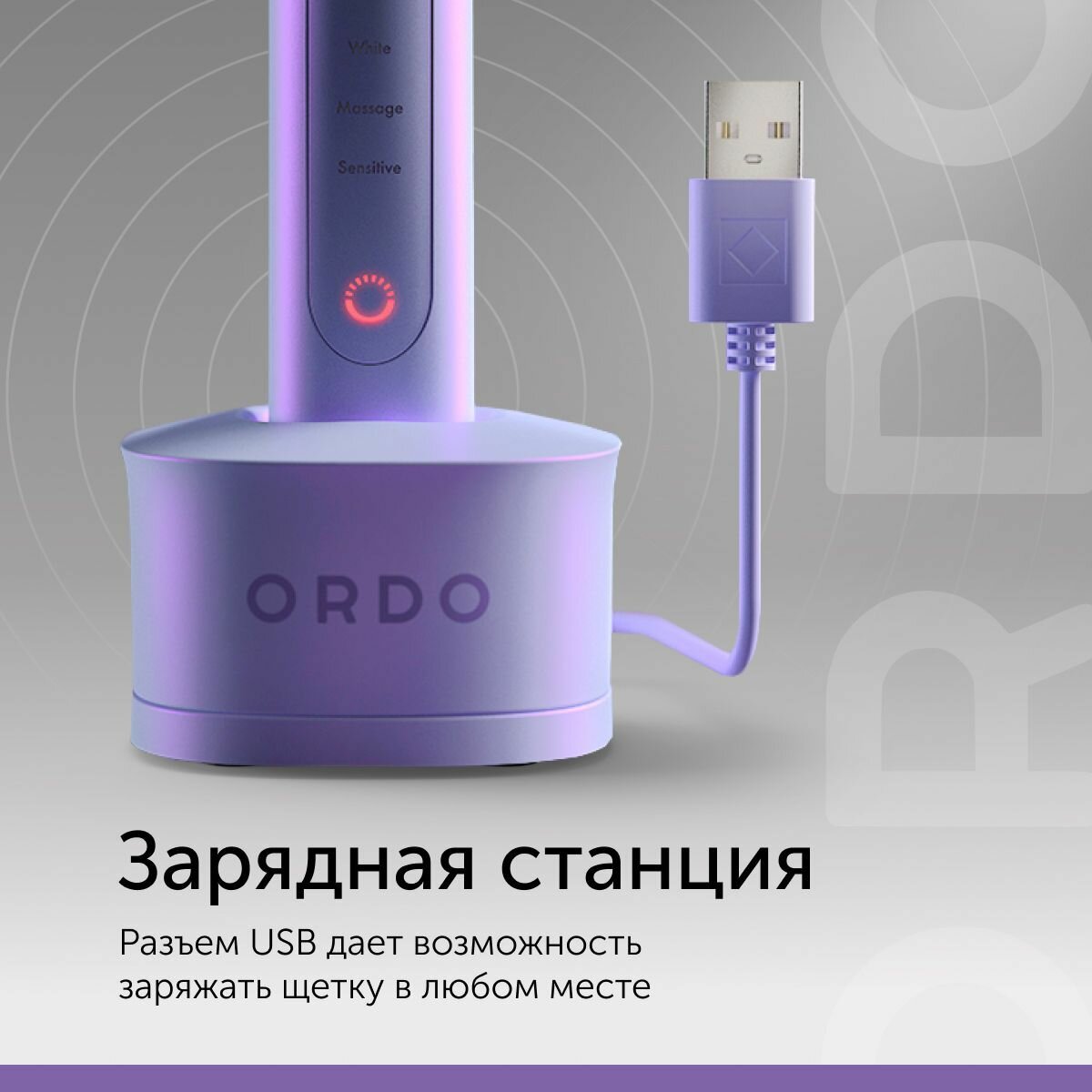 Электрическая зубная щетка ORDO Sonic+ звуковая, 4 режима чистки, таймер на 2 мин, USB зарядка, с влагозащитой, фиолетовая