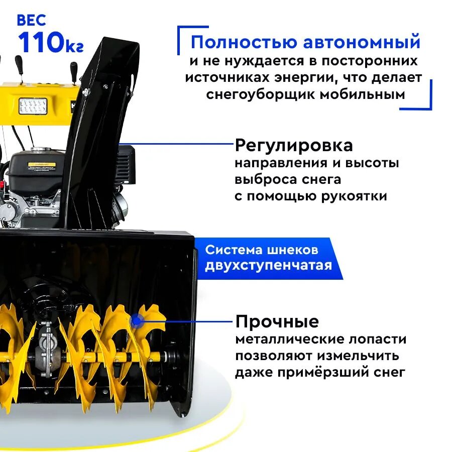 Мощный самоходный снегоуборщик и по характеристикам, и на деле. Для большого участка оптимальный вариант, если бюджет позволяет. Не стал экономить и не прогадал. Повышенные мощность, ширина обработки, проходимость. Без проблем запускается с электростартера в минусовые дни. Лопасти шнека крепкие. Берут без проблем затвердевший и подмерзший снег.