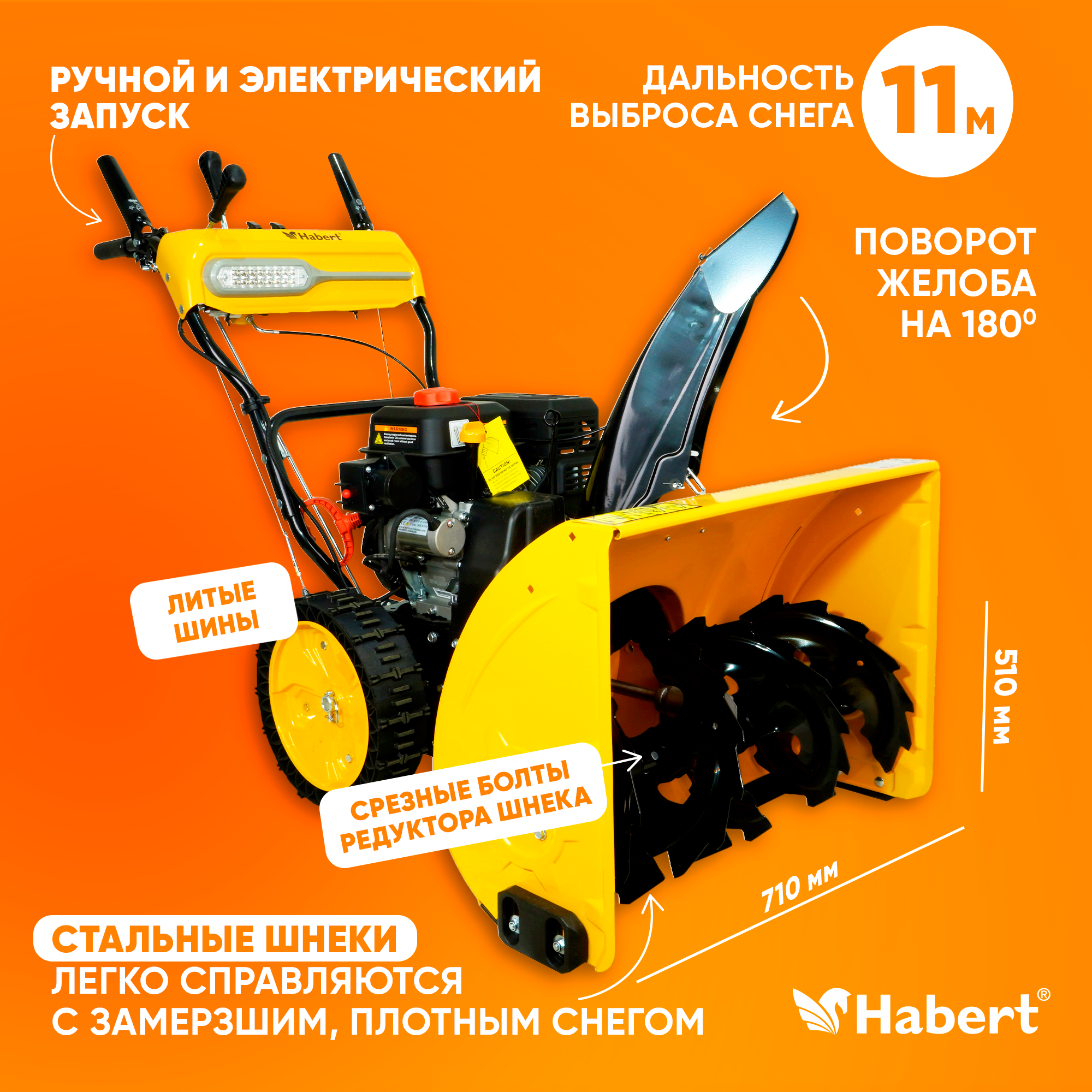 Купить Снегоуборщик бензиновый Habert HBM28D (ШЛ) (7лс, выброс 11м, фара, передачи 6 вперед 2 назад, электростарт, подогрев ручек, самоходный)