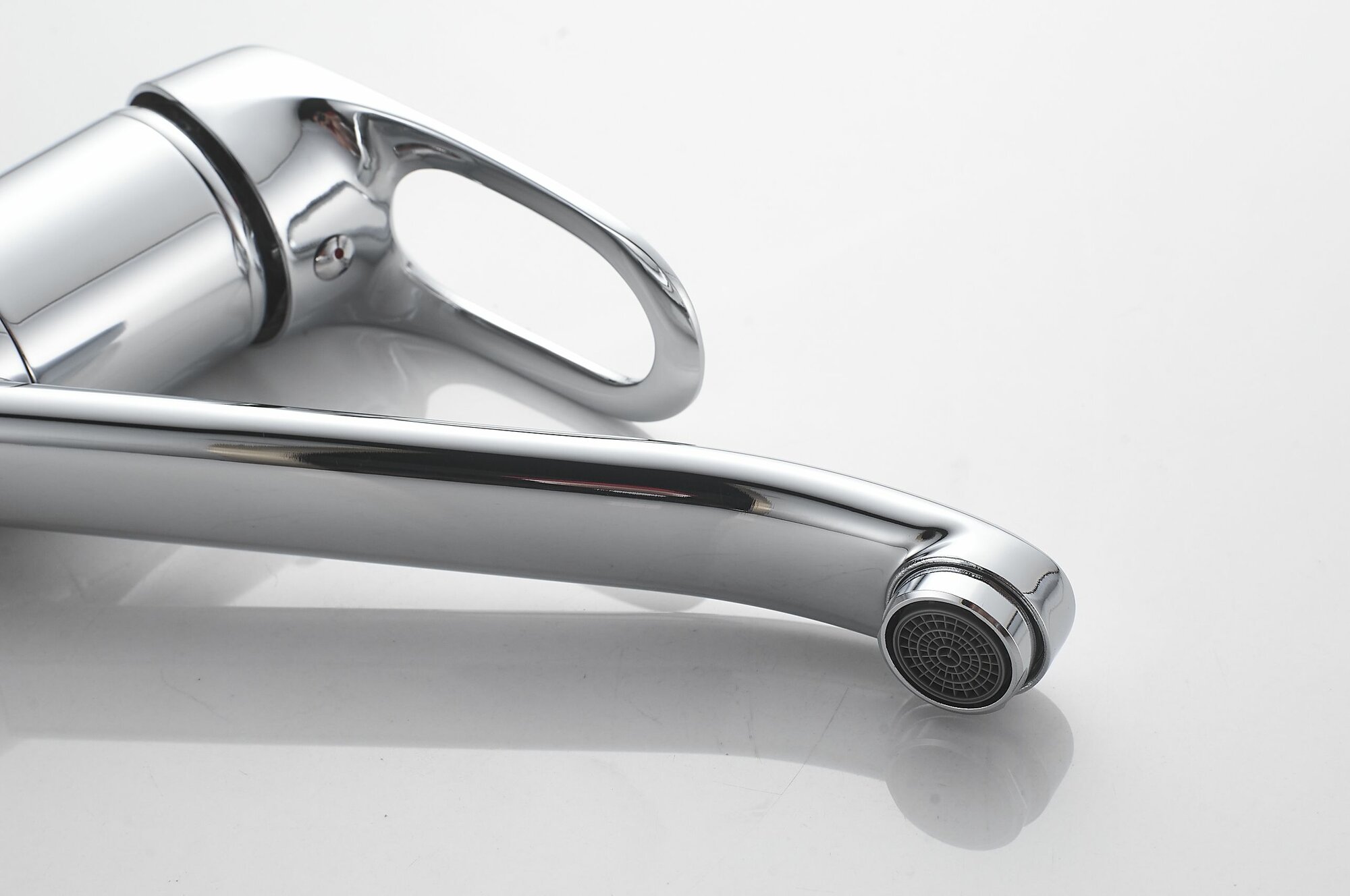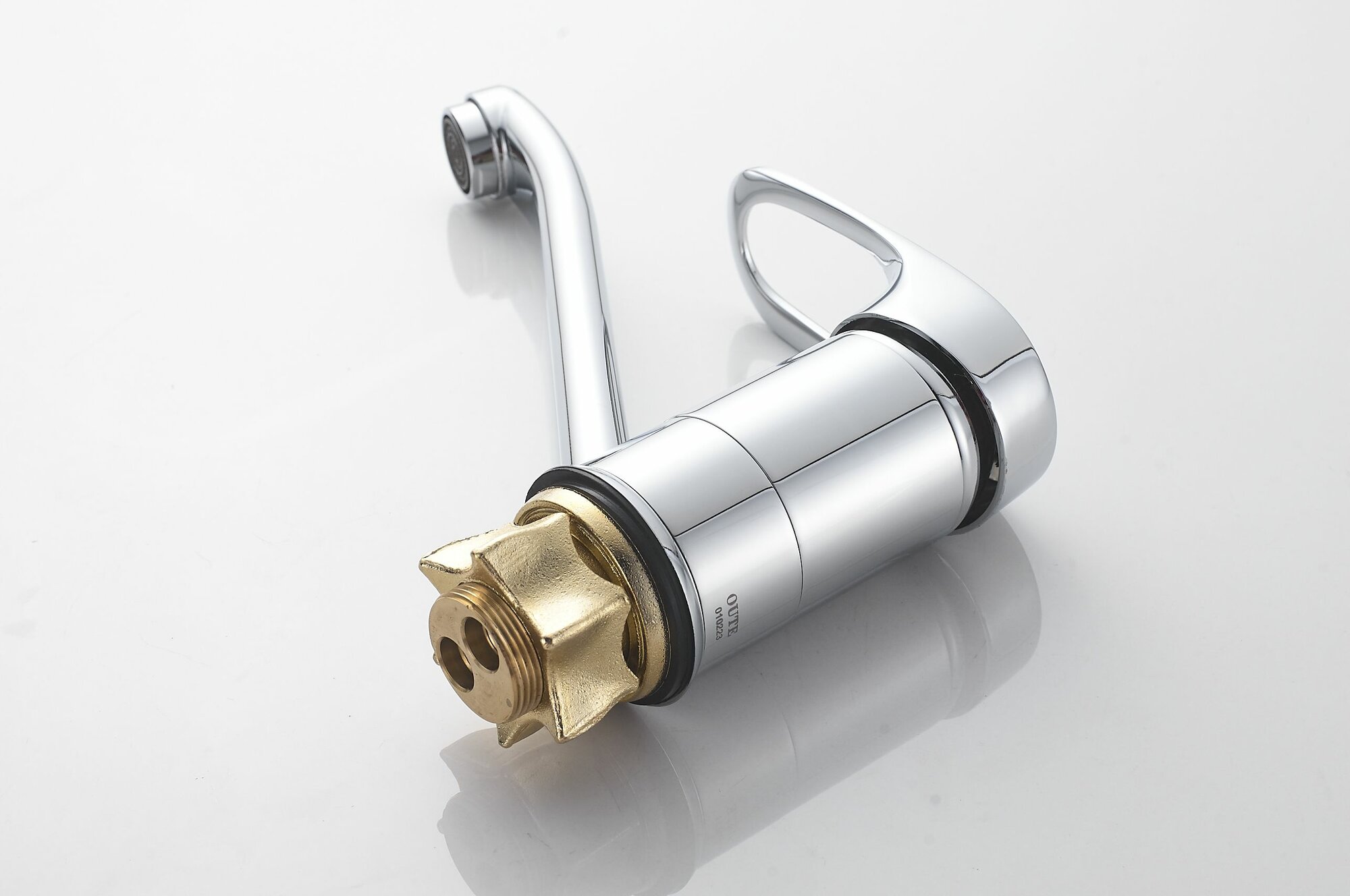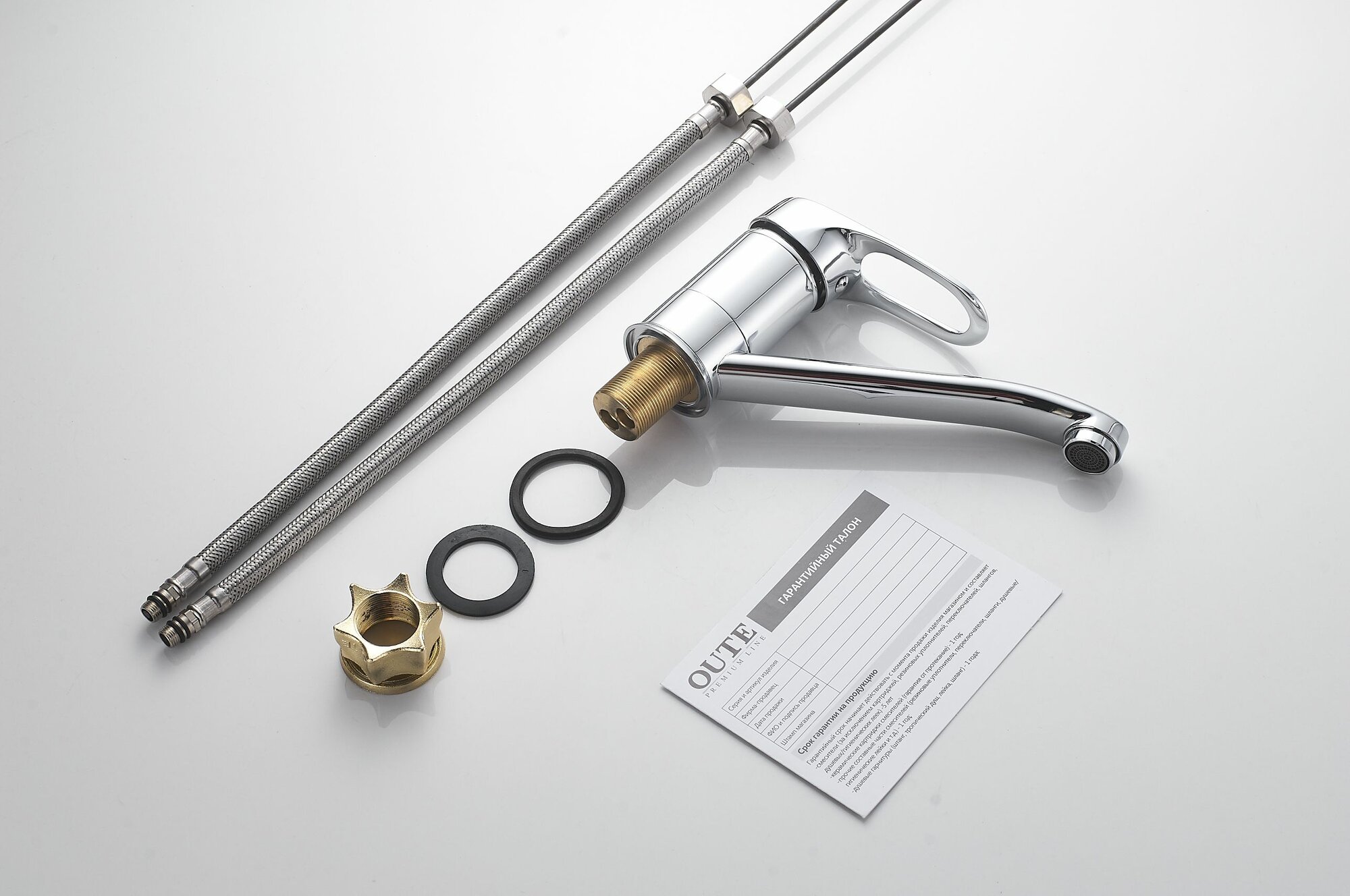 Смеситель для раковины OUTE однорычажное управление. Высота 130 mm. Поворотный излив 180 мм. Монтаж на одно отверстие, на гайке. Гибкая подводка. Присоединительный размер 1/2". С аэратором.Материал латунь.