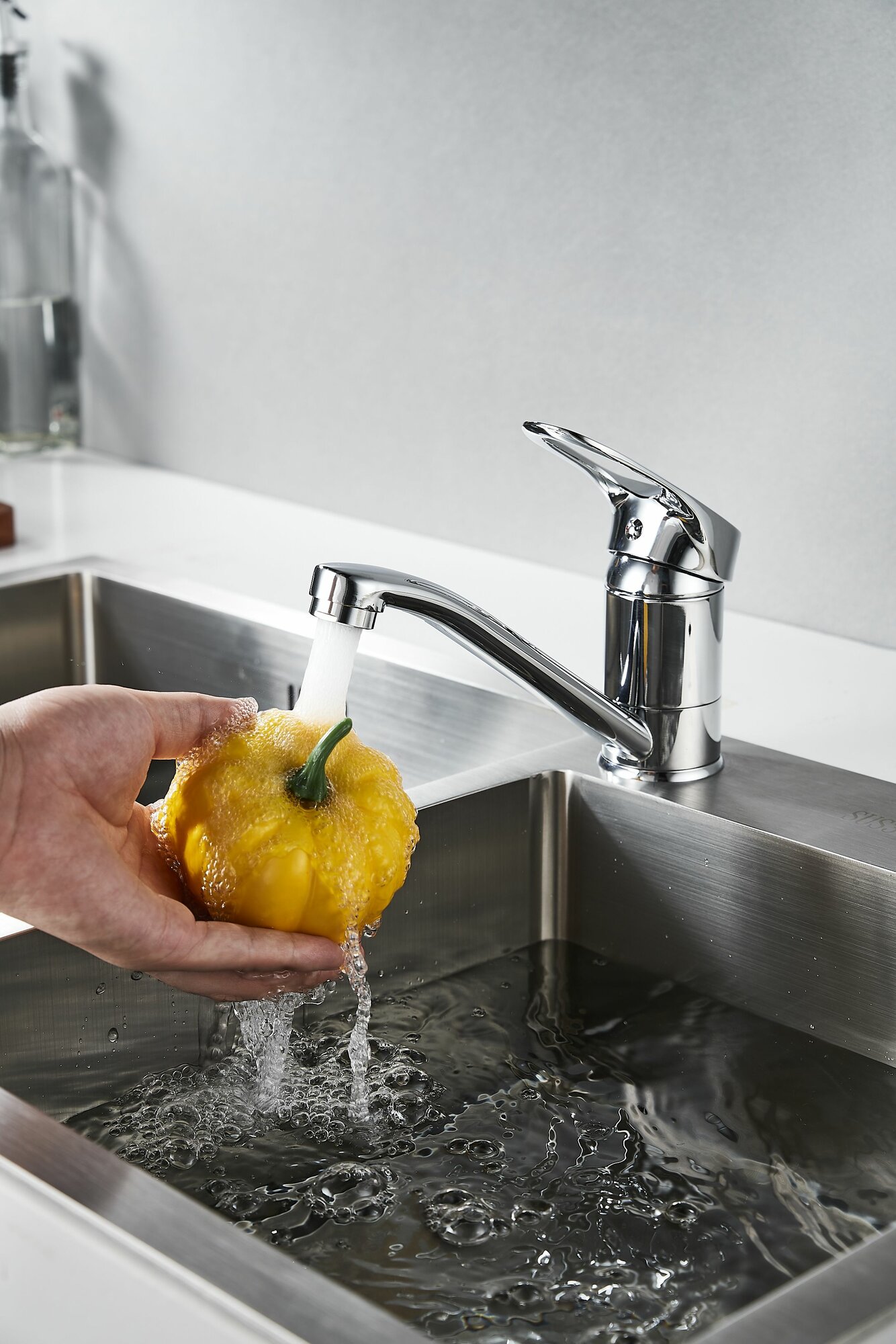 Смеситель для раковины OUTE однорычажное управление. Высота 130 mm. Поворотный излив. Монтаж на одно отверстие, на гайке. Гибкая подводка. Присоединительный размер 1/2. С аэратором.Материал латунь.