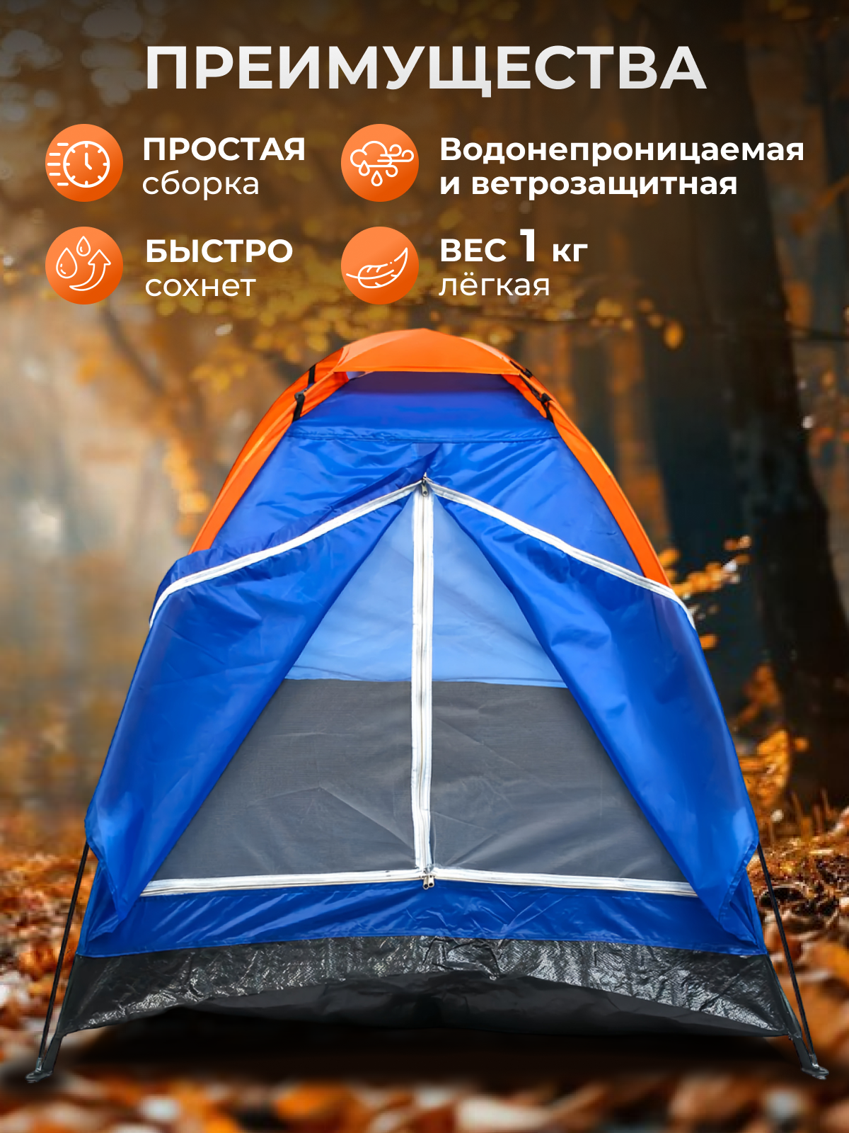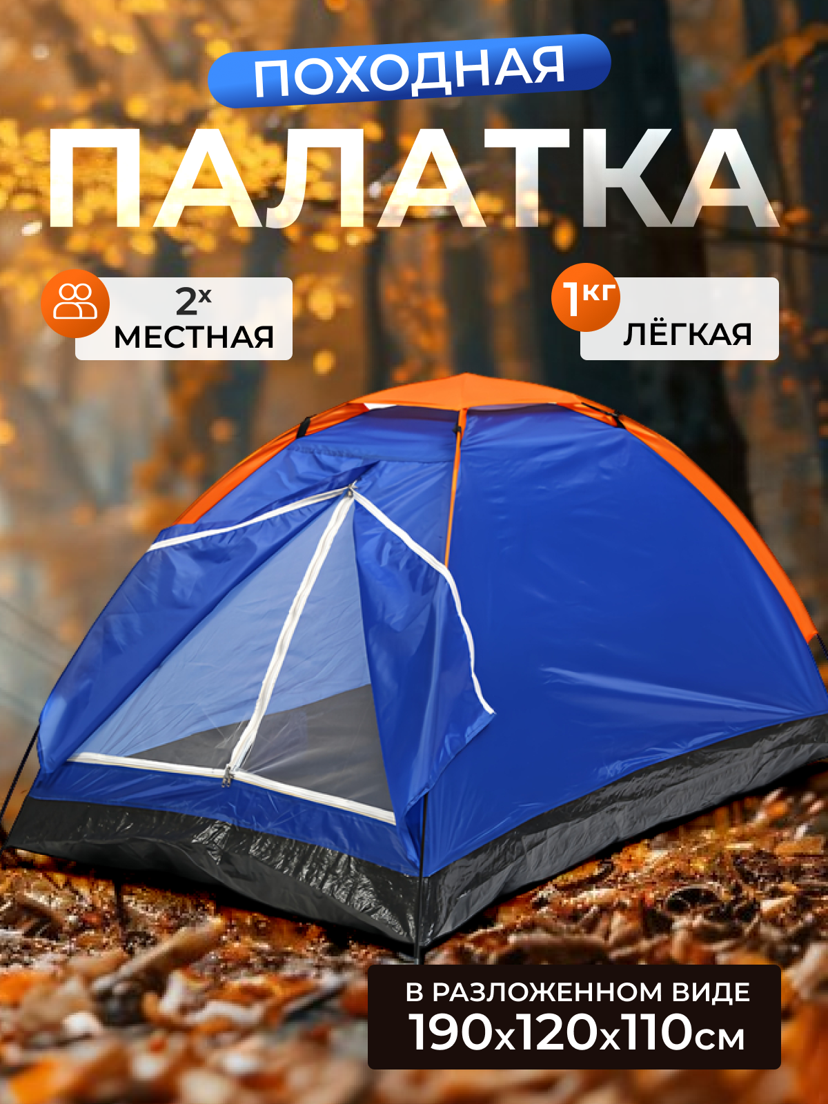 Палатка туристическая, 2 местная, однослойная, с чехлом, для рыбалки, походов и кемпинга, синяя, 1 кг интересное: