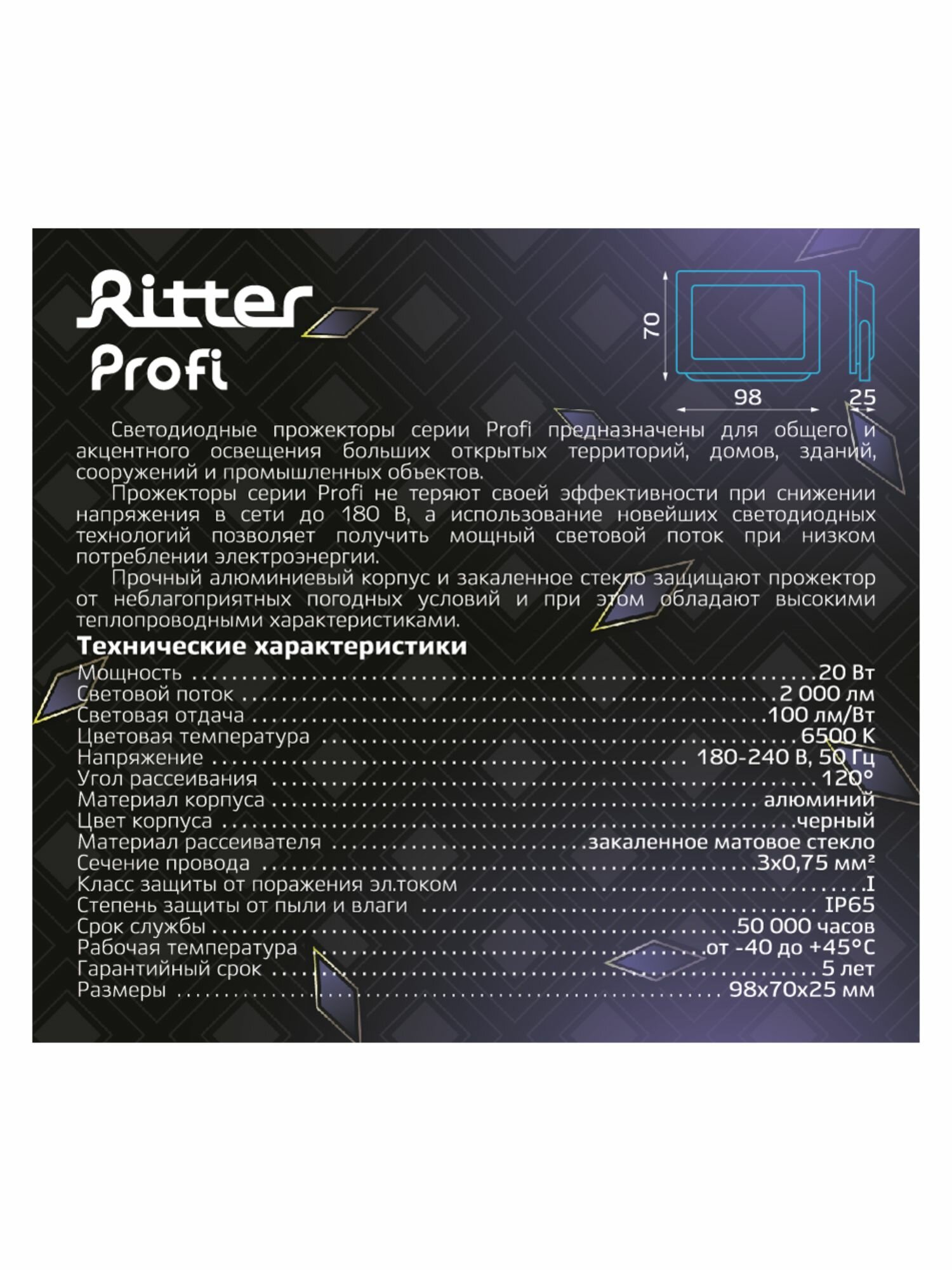 Прожектор светодиодный PROFI 70Вт, 180-240В, IP65, 4000К, 7000Лм, черный, Ritter, 53418 5