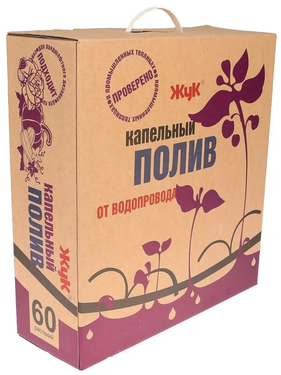 Капельный полив ЖУК от водопровода на 60 растений. "холодный полив"; выдерживает высокое давление и перепады высот;комплектация: цанговые соединения, компенсированные капельницы DR. DROP, стрелки, микротрубки, фильтр, шланг магистральный, заглушки, шило