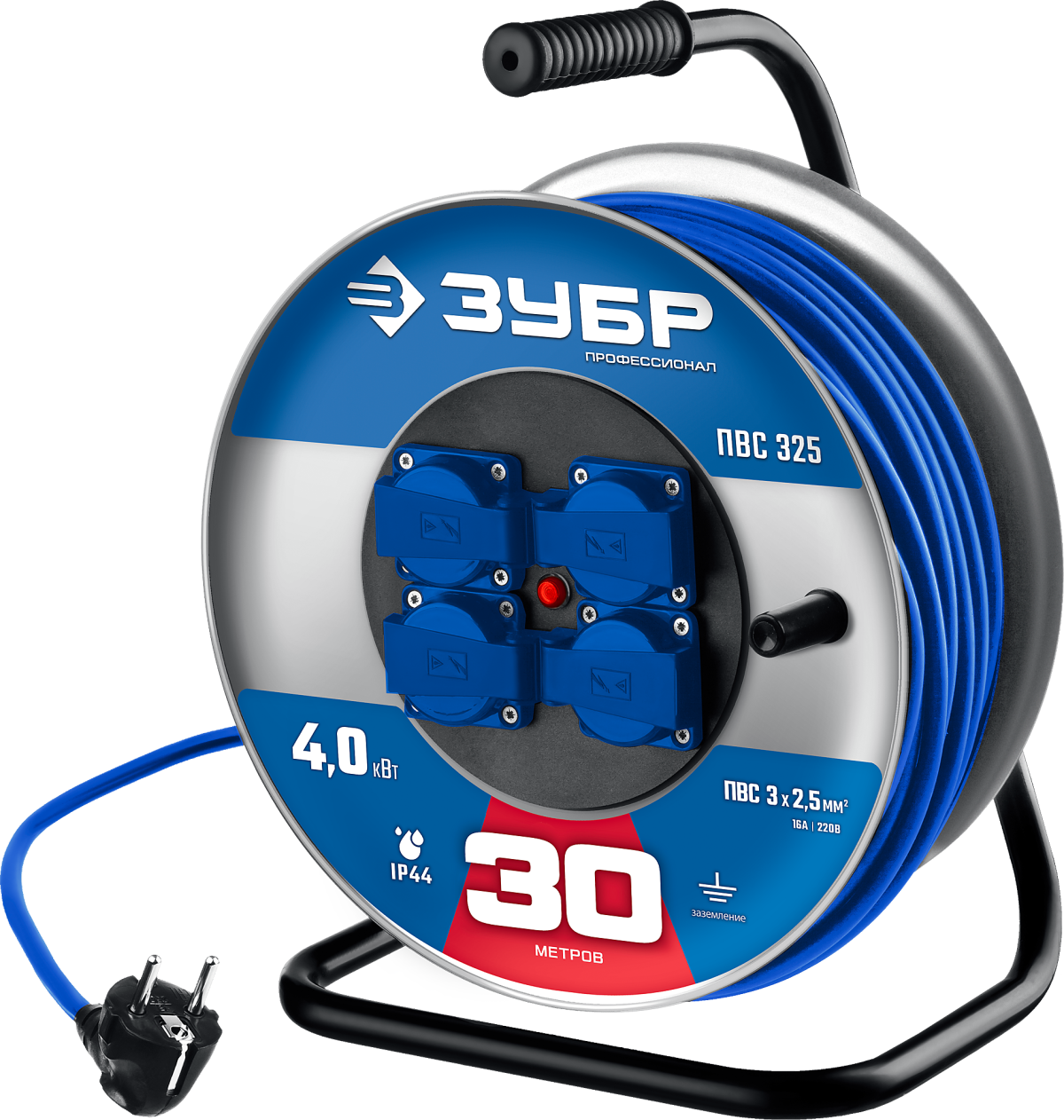 ЗУБР ПВС-325, ПВС, 3 x 2.5 мм2, 30 м, 4000 Вт, IP44, силовой удлинитель на стальной катушке, Профессионал (55102-30)