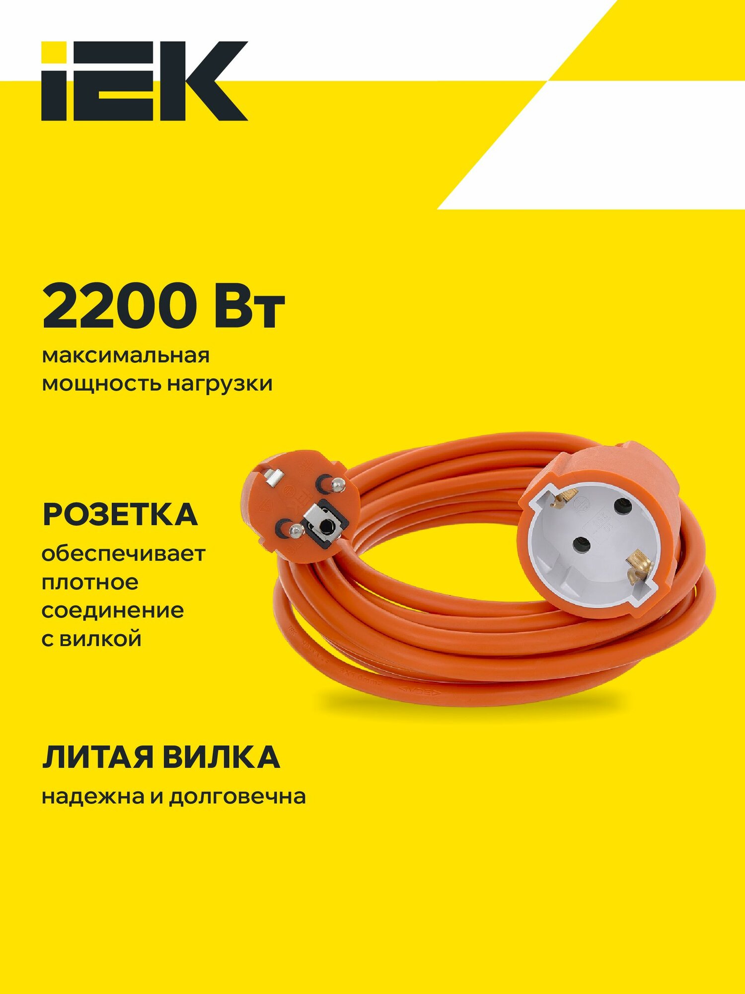 Удлинитель-шнур 1х5м вилка+розетка 10А 2P+PE с заземл. УШ-01РВ 3х1 оранж., IEK WUP10-05-K09-N (1 шт.)