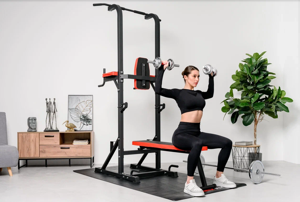 Турник-пресс-брусья со скамьей 3 в 1 UNIX Fit POWER TOWER 120P для домашних тренировок, 2 хвата, нагрузка на скамью до 240 кг, длина перекладины 109 см,182 x 109 x 222 см. UNIXFIT