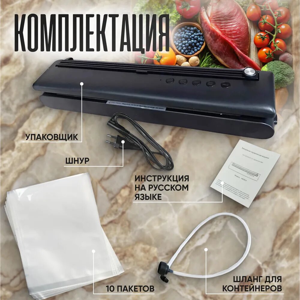 | Подробная комплектация | Вакууматор (запаиватель пакетов) с резаком; пакеты для вакууматора 10 шт.; Инструкция на русском языке |