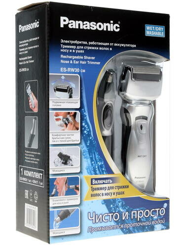 | Подробная комплектация | электробритва Panasonic ES-RW30, триммер для стрижки в носу и ушах ER417, документация, подставка для зарядки, щеточка для чистки |