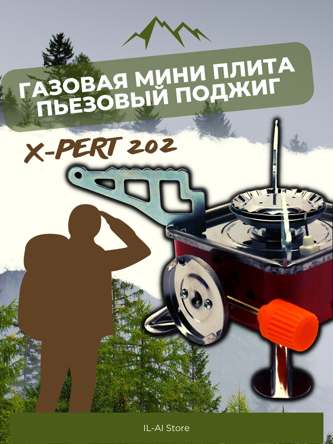 Газовая мини плита X-PERT 2030 с ветрозащитой / Портативная / Туристическая / Походный / Одна конфорка / Кемпинг / Сверхлегкая