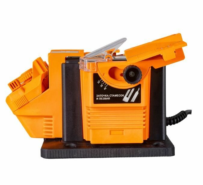 Компактный, фиксируется на верстаке. Насадки для сверл, ножей, лезвий, стамесок.