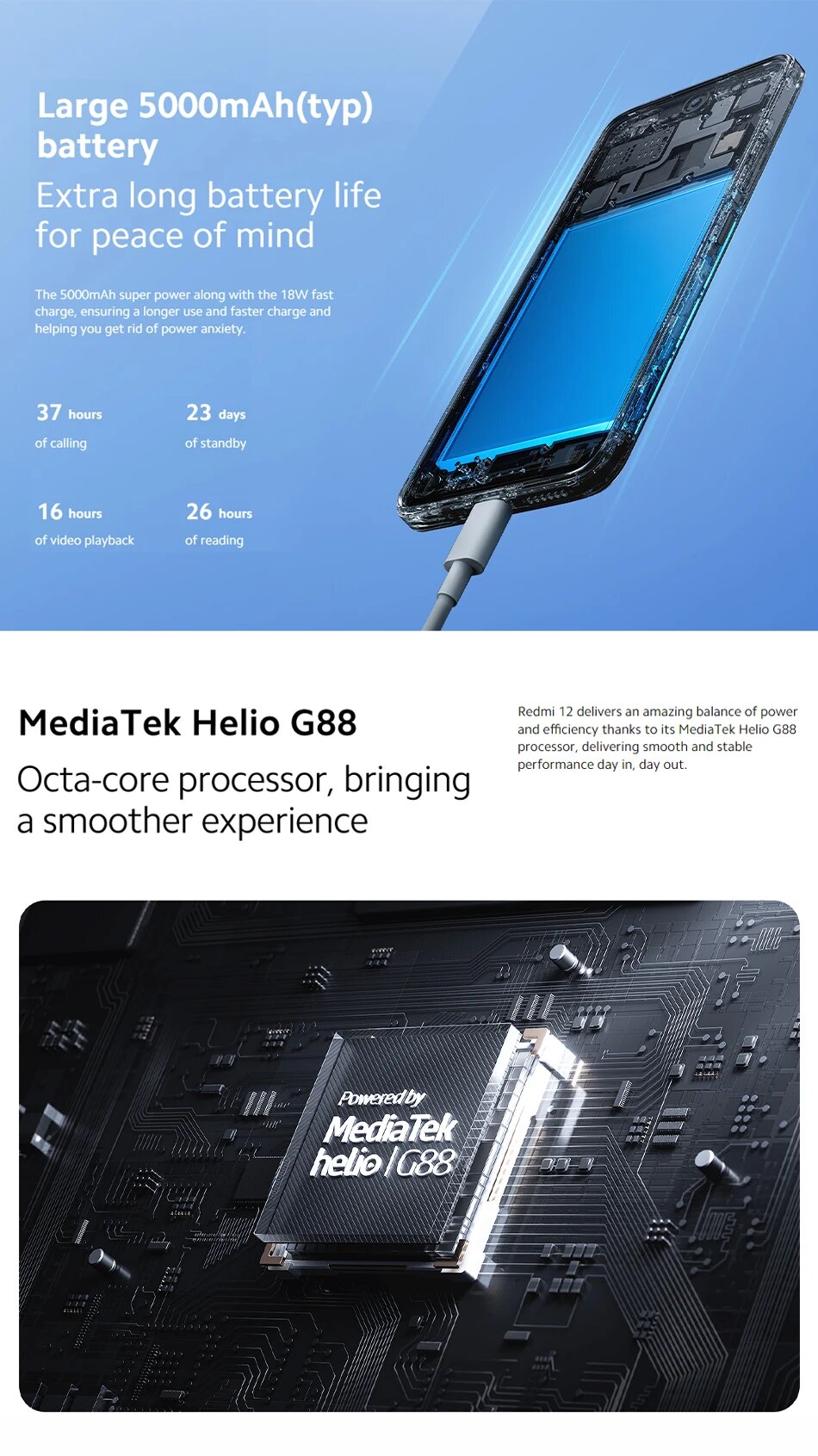 Телефон Xiaomi Redmi 12 с тройной камерой 50 МП, процессором MTK Helio G88, 18 Вт, 5000 мАч, 90 Гц