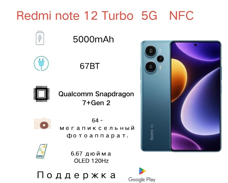 GG2,Смартфон Xiaomi Redmi note 12 Turbo, Русский, NFC, Google Play,