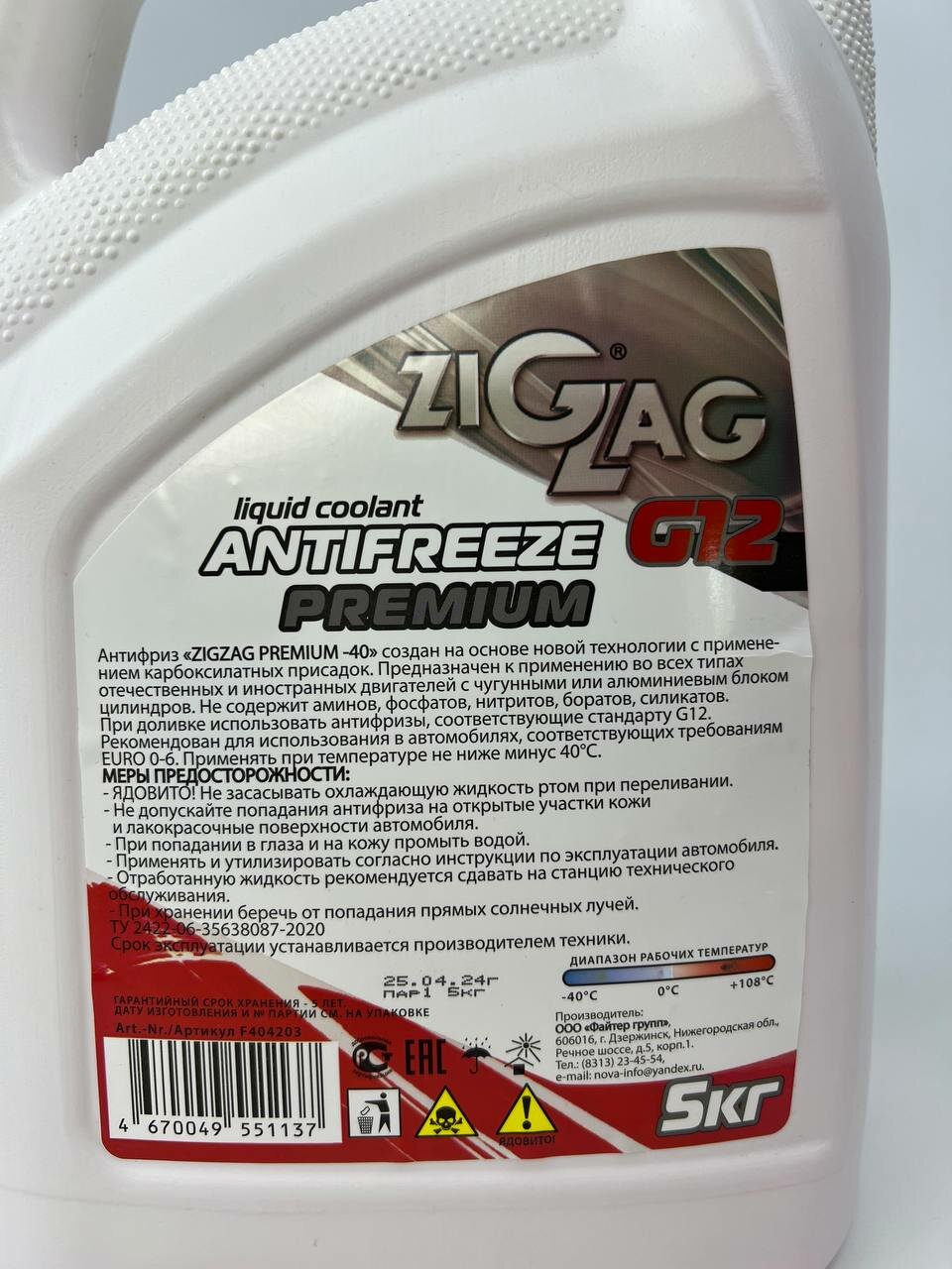 Антифриз ZIGZAG PREMIUM G12 –40°C, 10 кг, готовая охлаждающая жидкость для масляной системы автомобиля