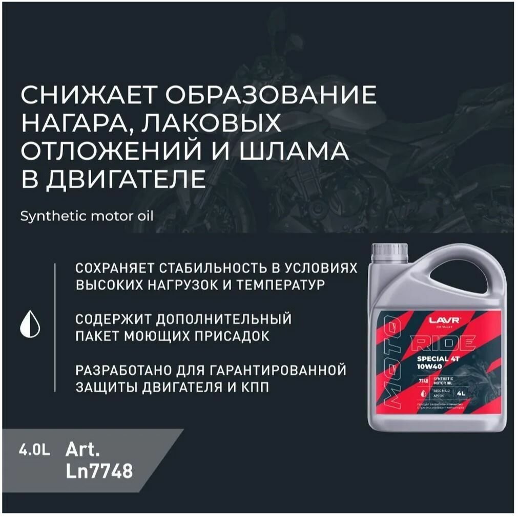 Моторное масло Lavr Moto Ride Special 4Т 10W40 SN, 4 л Ln7748 Lavr 9568834 .