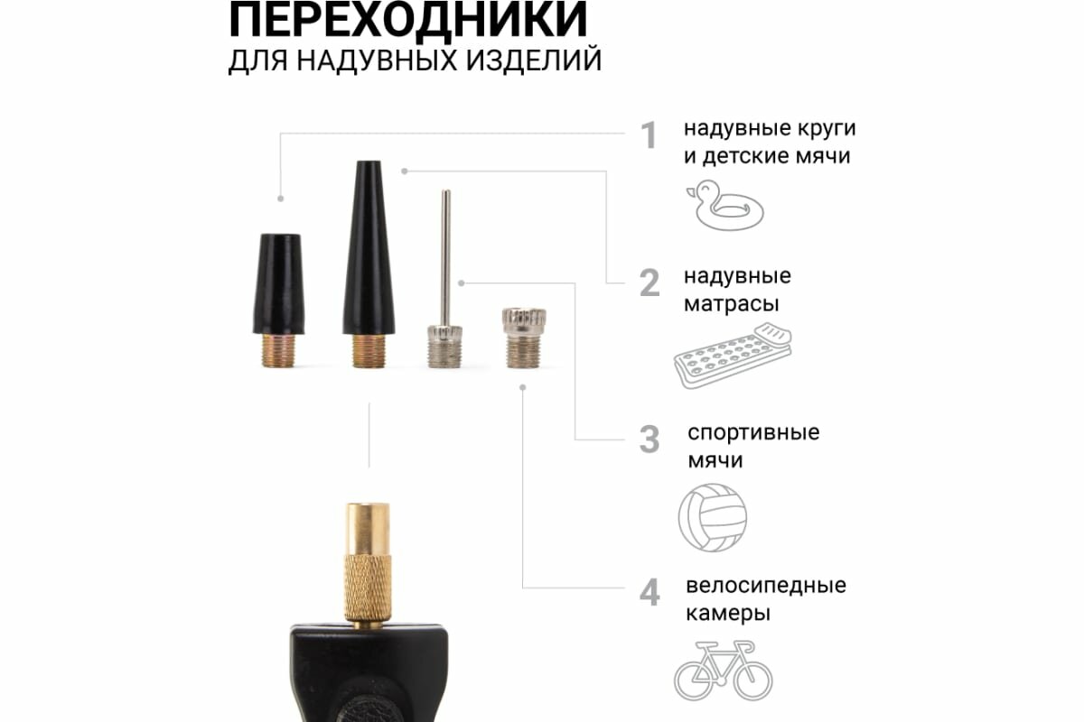 | В наборе | комплект насадок / переходник для велосипедных шин / переходник для лодок / переходник для матрасов / переходник для мячей / сумка для хранения |