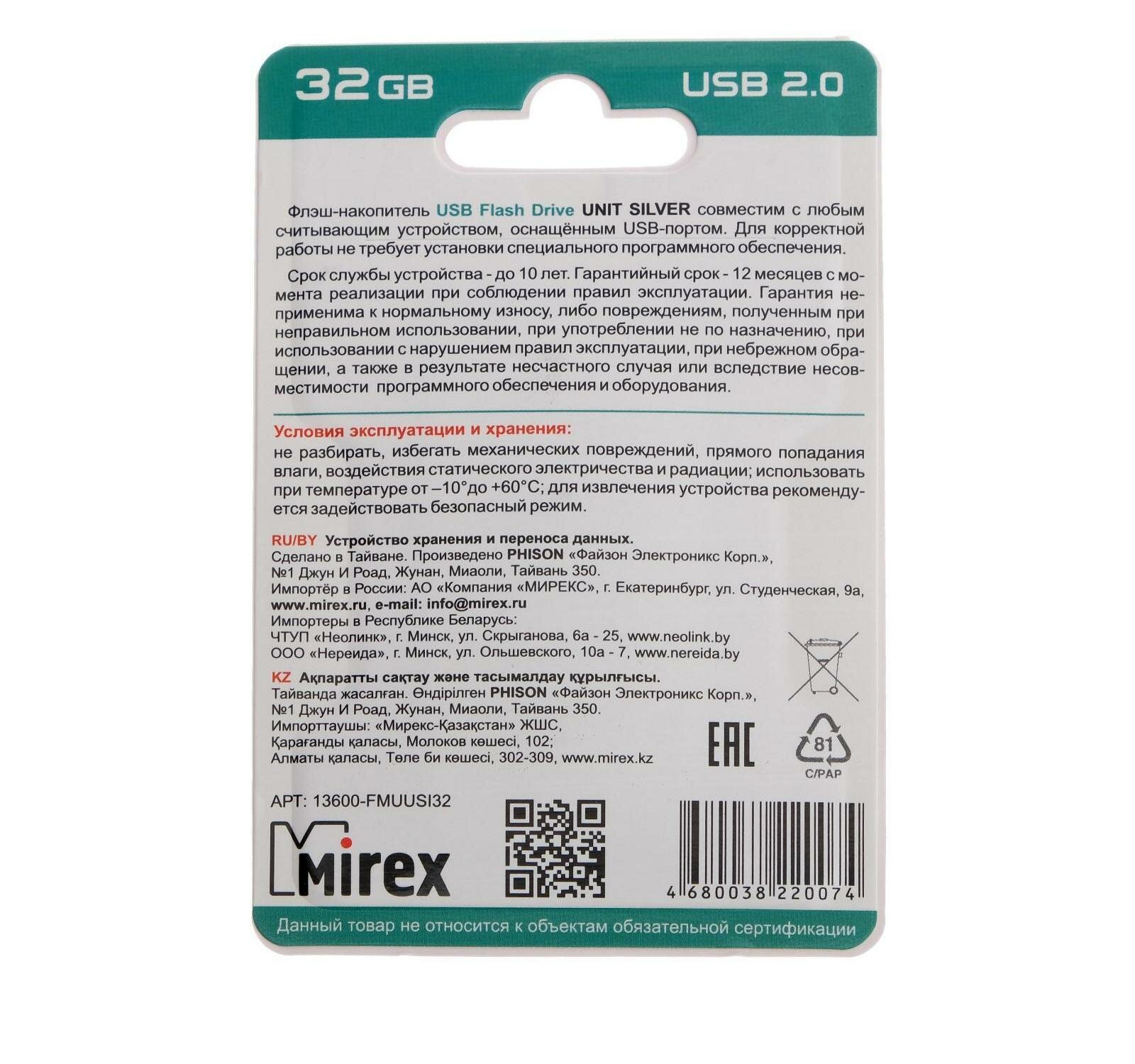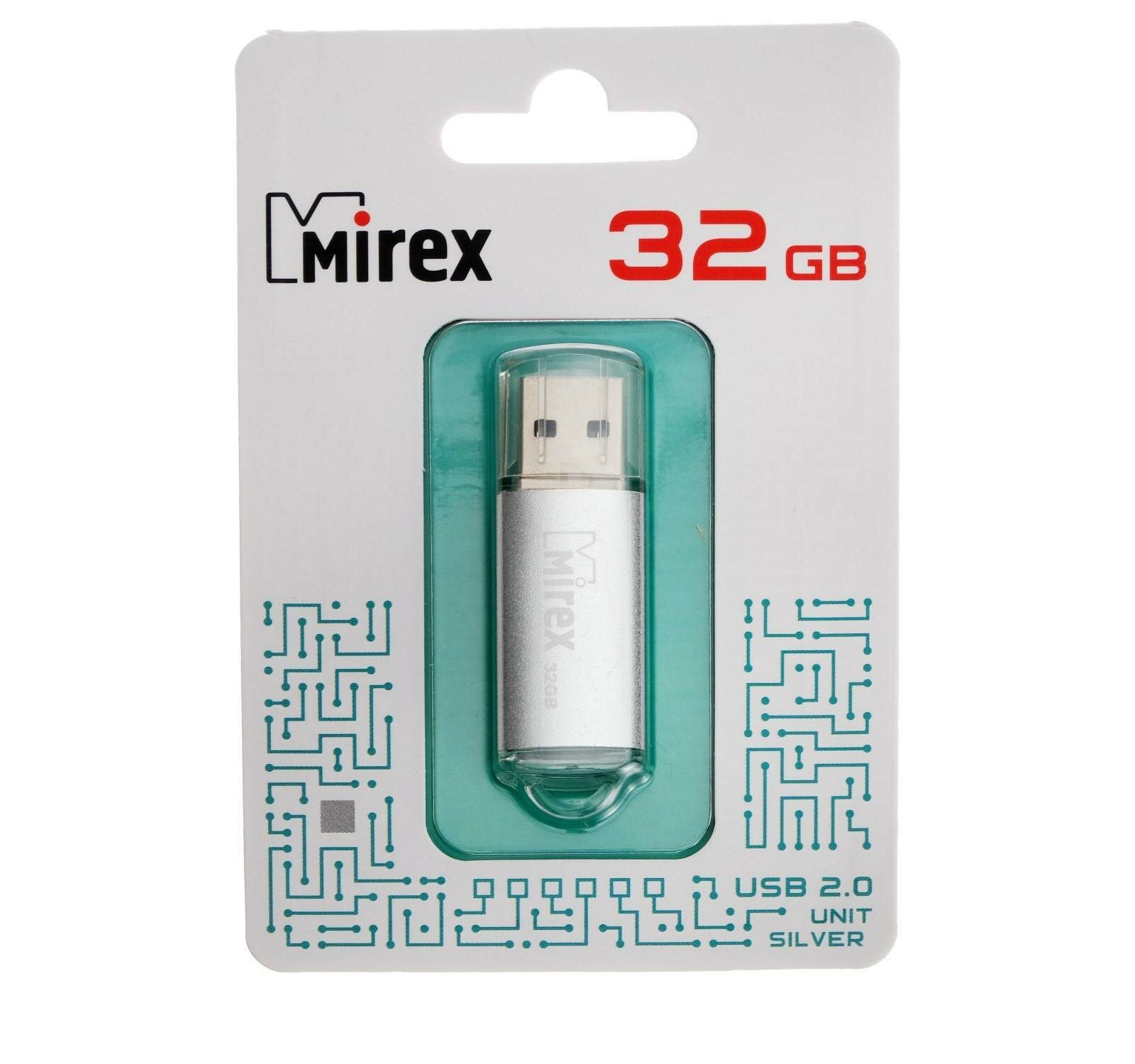 Купить Флешка Mirex UNIT SILVER, 32 Гб, USB2.0, чт до 25 Мб/с, зап до 15 Мб/с, серебристая