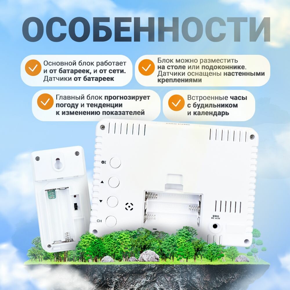 | Дополнительная информация | частота радиосигнала: 433,92 МГц; радиус радиосигнала: 100 м (в прямой видимости); 3 наружных термогигродатчика в комплекте |