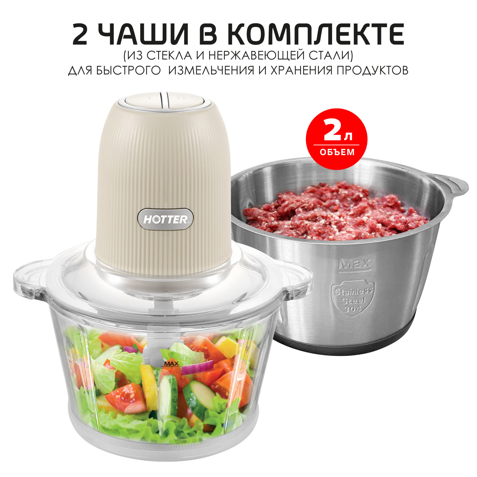 Измельчитель кухонный электрический HOTTER HX-22 бежевый, 2 чаши (стекло и нерж сталь), 500Вт, 2 скорости / чоппер интересное: