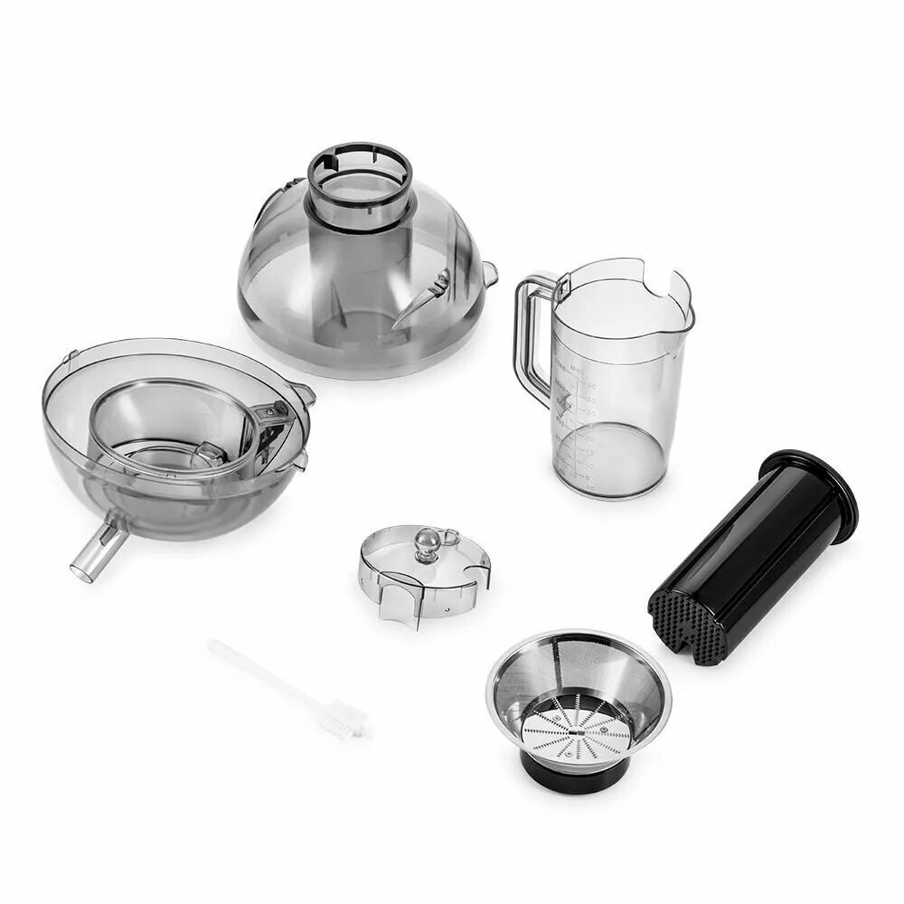 | Подробная комплектация | 1. Соковыжималка –– 1 шт. • Моторный блок — 1 шт. • Чаша — 1 шт. • Фильтр — 1 шт. • Крышка — 1 шт. 2. Толкатель — 1 шт. 3. Контейнер для сока с крышкой — 1 шт. 4. Щеточка для чистки — 1 шт. 5. Руководство по эксплуатации — 1 шт. |