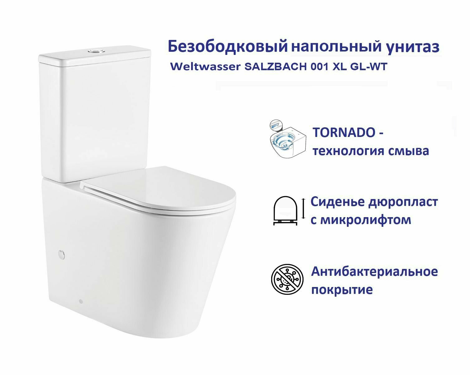 Унитаз компакт WeltWasser SALZBACH 001 XL GL-WT, безободковый, с сиденьем микролифт, белый глянец