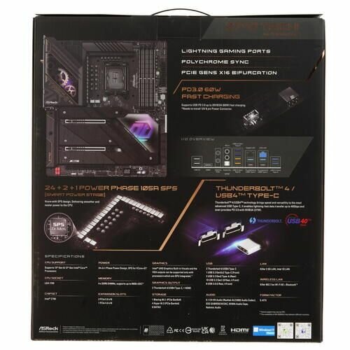 | Разъемы на задней панели | HDMI, LAN RJ-45 x 2, SMA (для антенны Wi-Fi) x 2, Thunderbolt 4 Type-C x 2, USB 2.0 Type-A x 2, USB 3.2 Gen1 Type-A x 6, USB 3.2 Gen2 Type-A x 2, выход S/PDIF оптический |