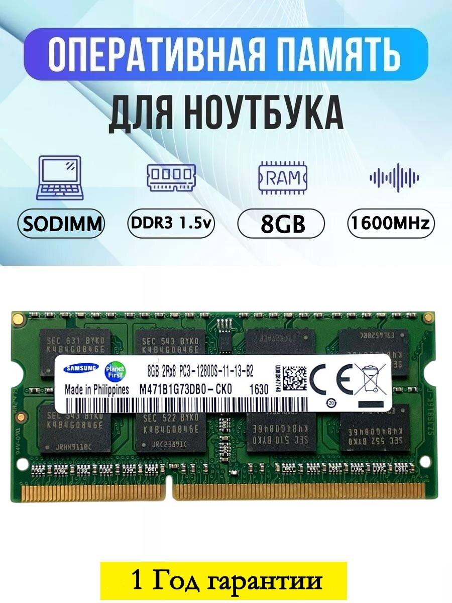 Оперативная память для ноутбука Samsung DDR3 8 ГБ 1600 МГц 1.5v CL11 SODIMM M471B1G73BH0-CK0