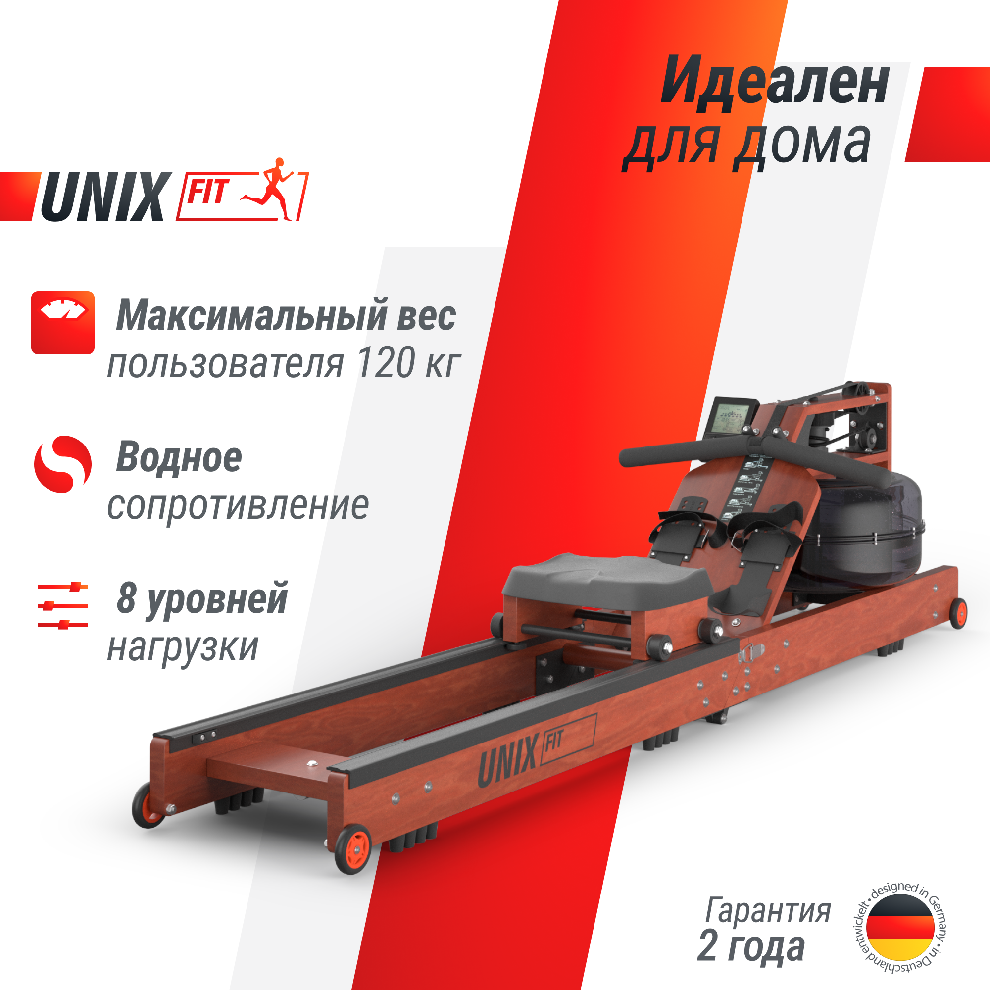 Гребной тренажер водный UNIX Fit Wood Rower Dark, древесина бука, складной, до 120 кг, 8 программ, ремень нейлон, анатомическое сидение