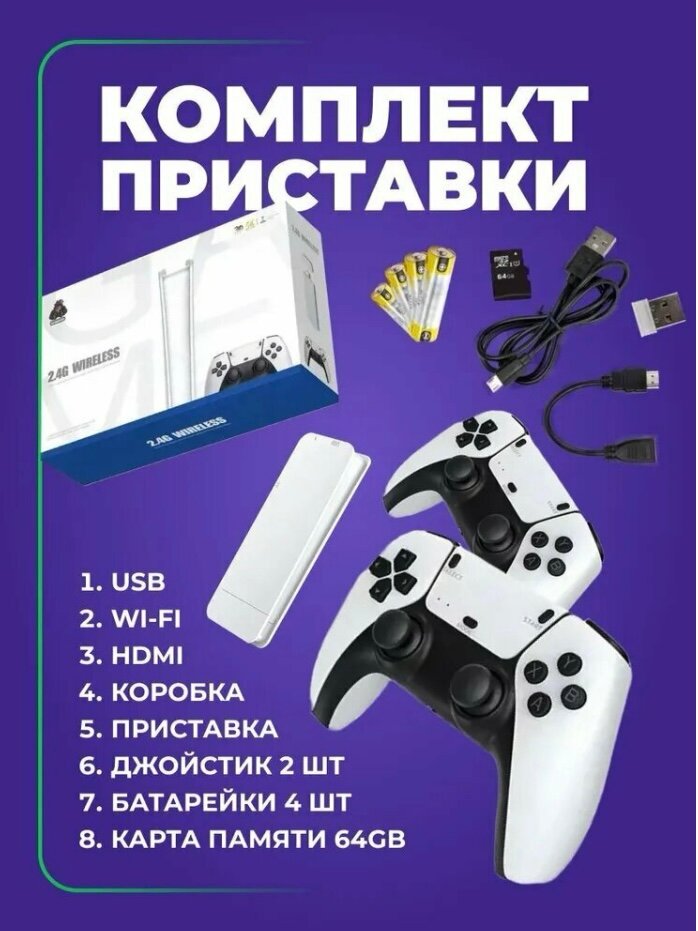 | Подробная комплектация | Приставка игровая, 2 геймпада, карта памяти microSD, адаптер для работы джойстиков, удлинитель HDMI, шнур MicroUSB, инструкция на русском языке, коробка. |