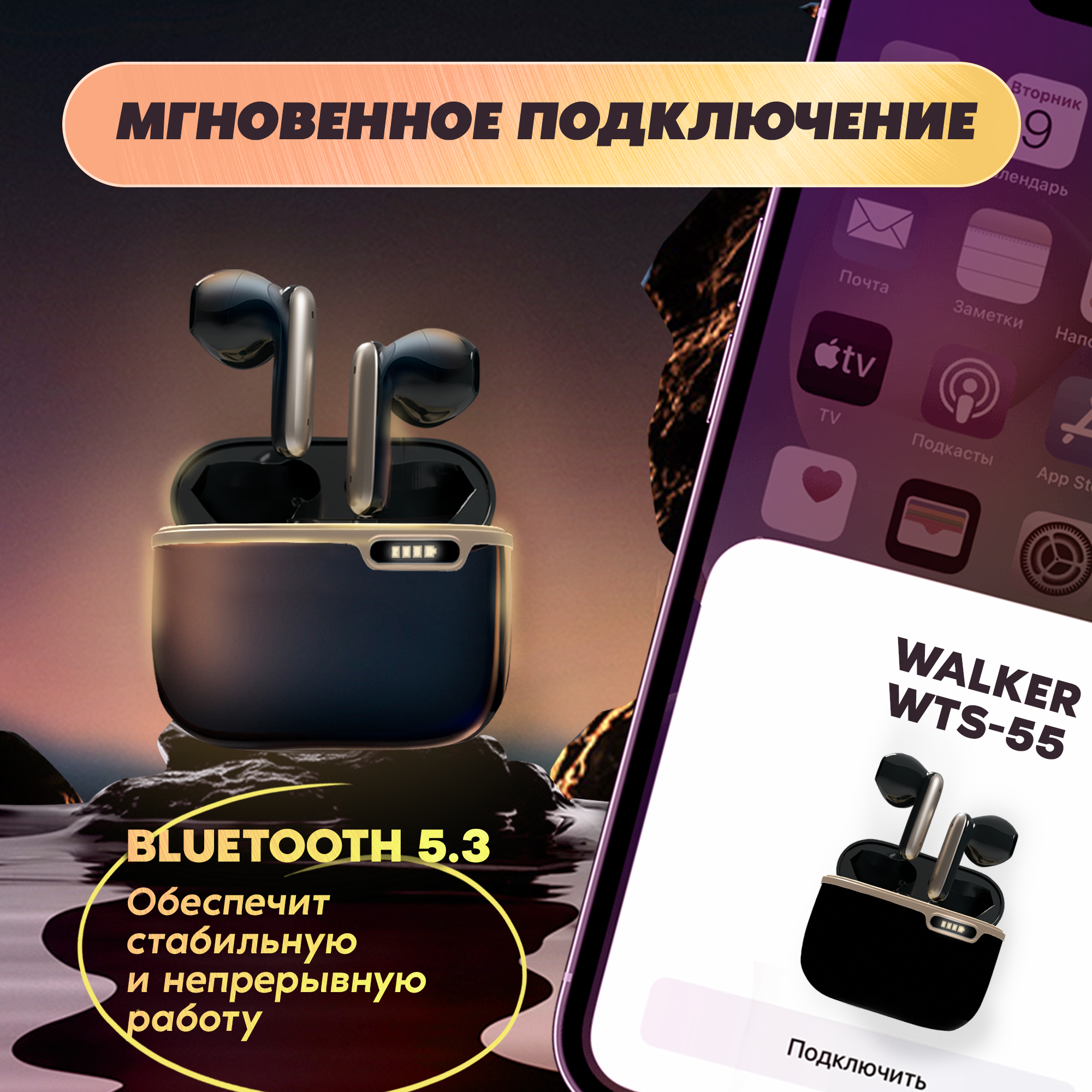 Беспроводные наушники для телефона Bluetooth с микрофоном WALKER WTS-55, сенсорное управление, без проводные TWS, блютуз, для iphone и Android, черные