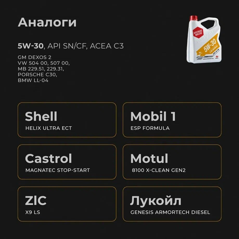 | Допуски OEM | BMW Longlife-04 / GM Dexos 2 / PORSCHE C30 / MB 229.51 / 229.31 / VW 504.00/507.00 |