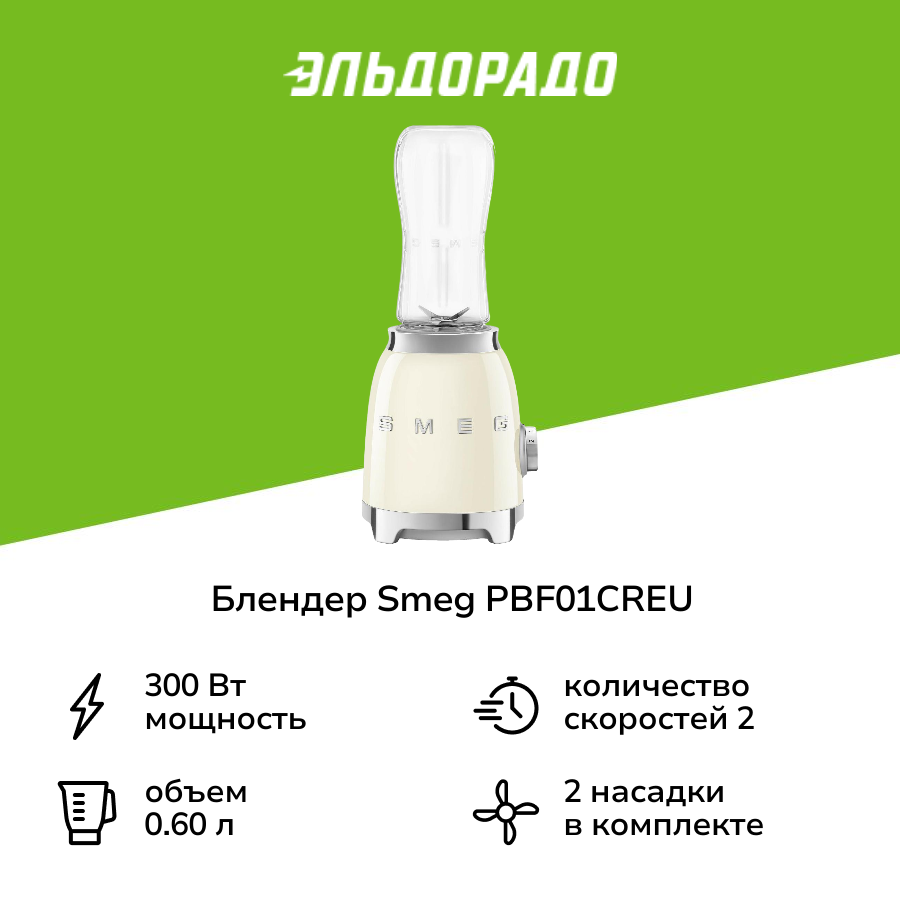 Блендер Smeg PBF01WHEU, мощность 300 Ватт, стакан для смузи, защита от перегрузки двигателя