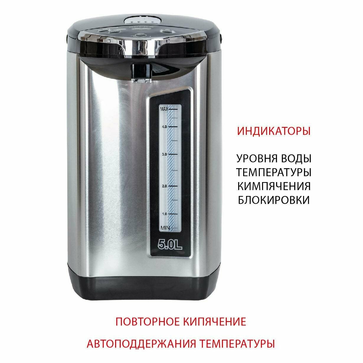 | Плюсы: | Подсветка уровня воды, 5 литров объем, выбор поддержания температуры |