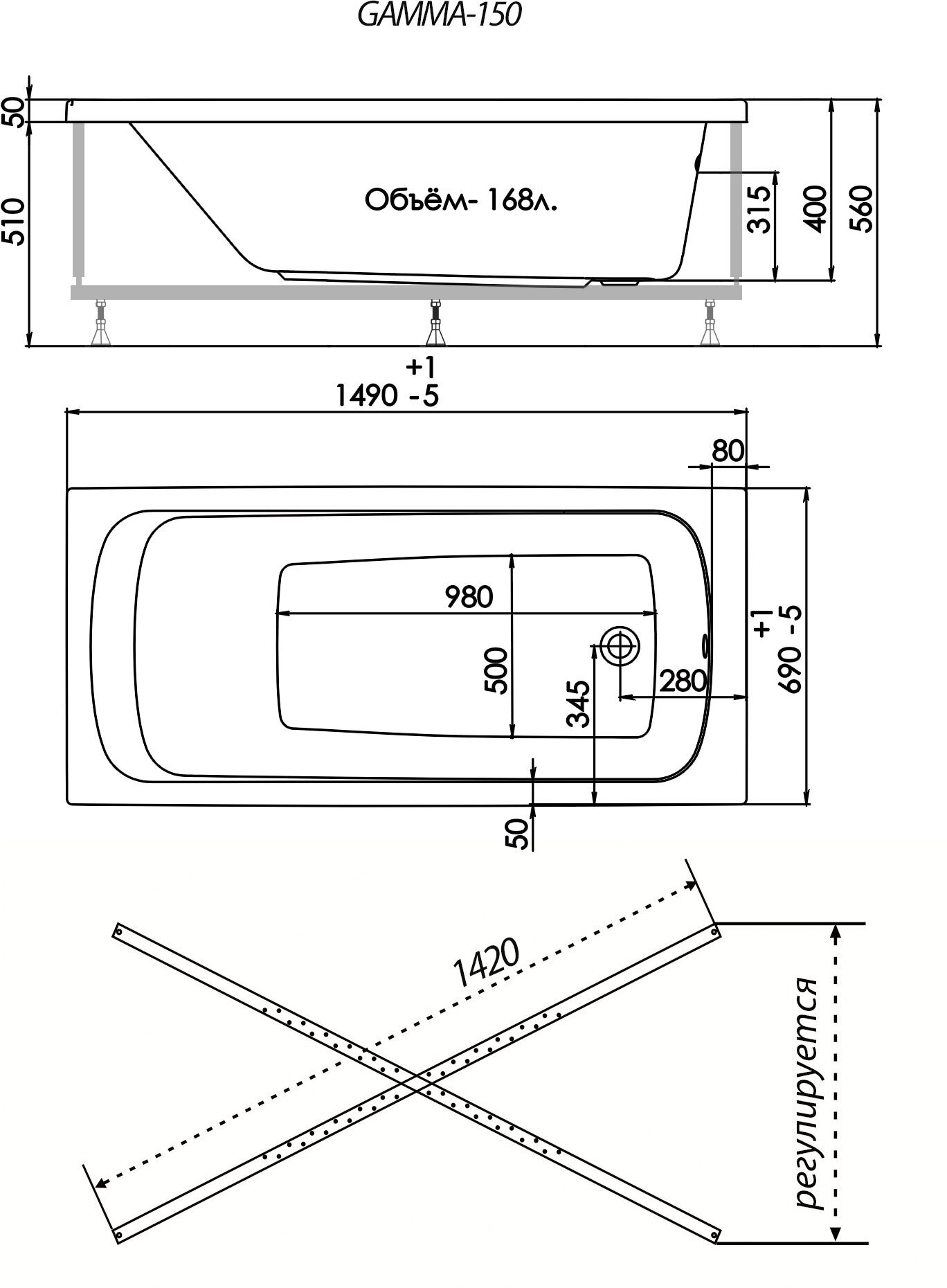 Акриловая ванна 1ACReal Gamma 150 на каркасе
