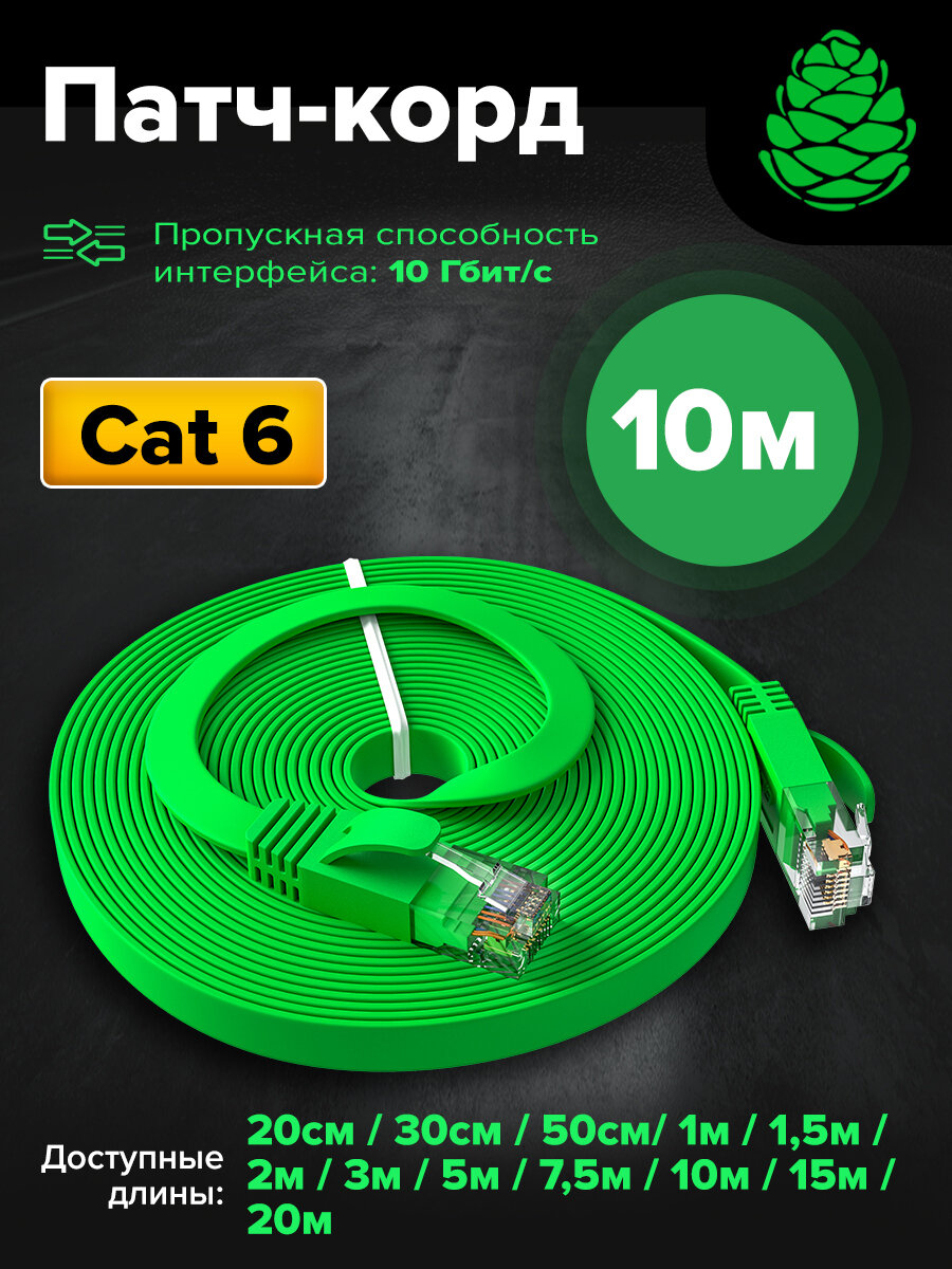 Купить Патч-корд плоский 10 метров GCR PROF кабель для интернета КАТ.6 ethernet high speed 10 Гбит/с зеленый
