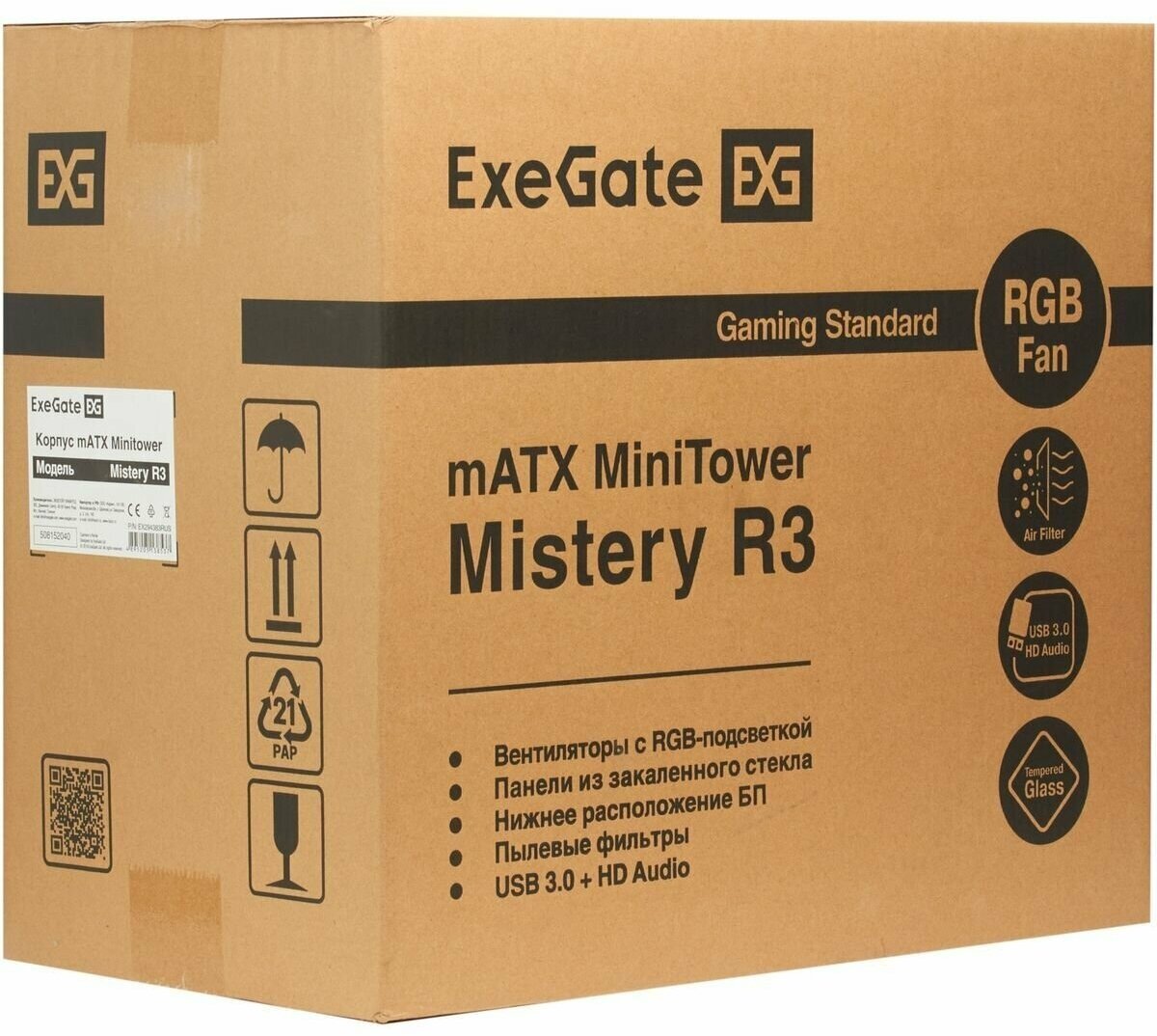 Корпус Minitower ExeGate Mistery R3-NPX600 (mATX, БП 600NPX с вент. 12 см, 2*USB+1*USB3.0, аудио, черный, 4 вент. 12см с RGB подсветкой, боковая панель - закаленное стекло) EX294479RUS