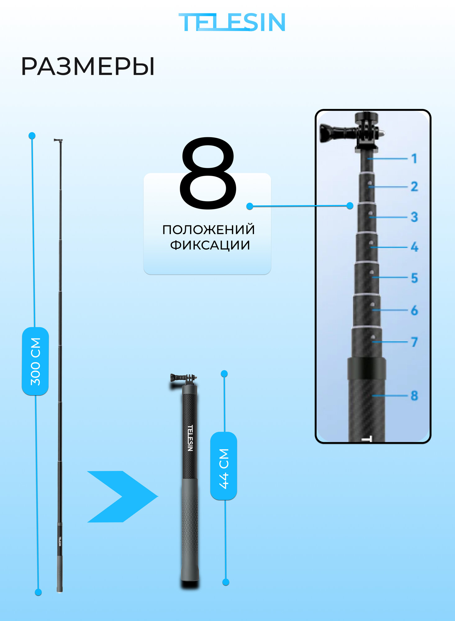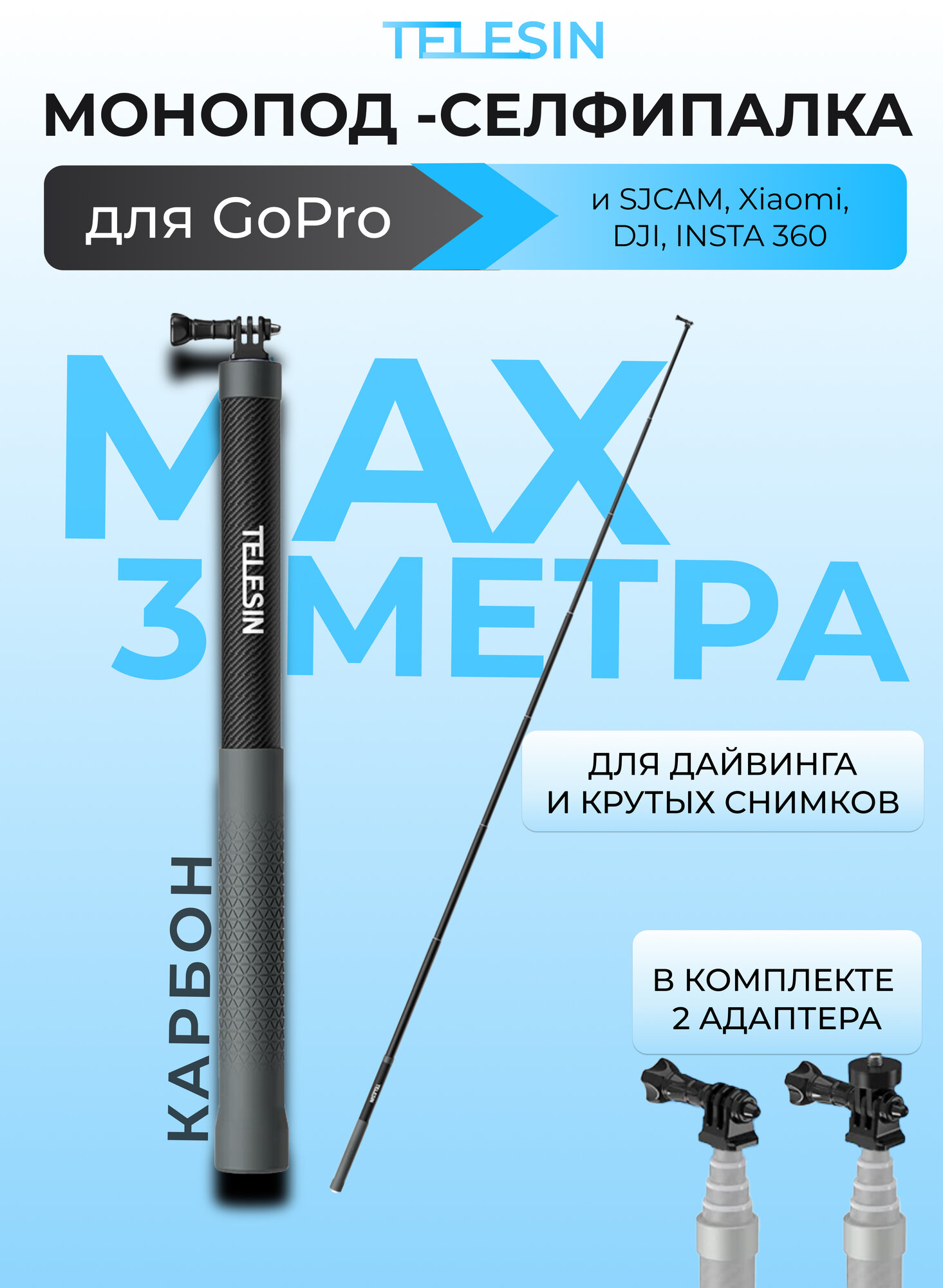 Монопод TELESIN Carbon Fiber Selfie Stick (3м) интересное: