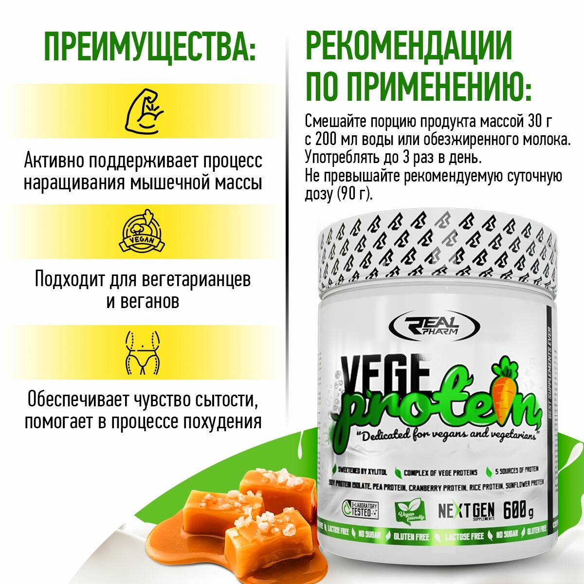 Растительный протеин, Real Pharm Vege protein, порошок 600г со вкусом Солёная карамель интересное: